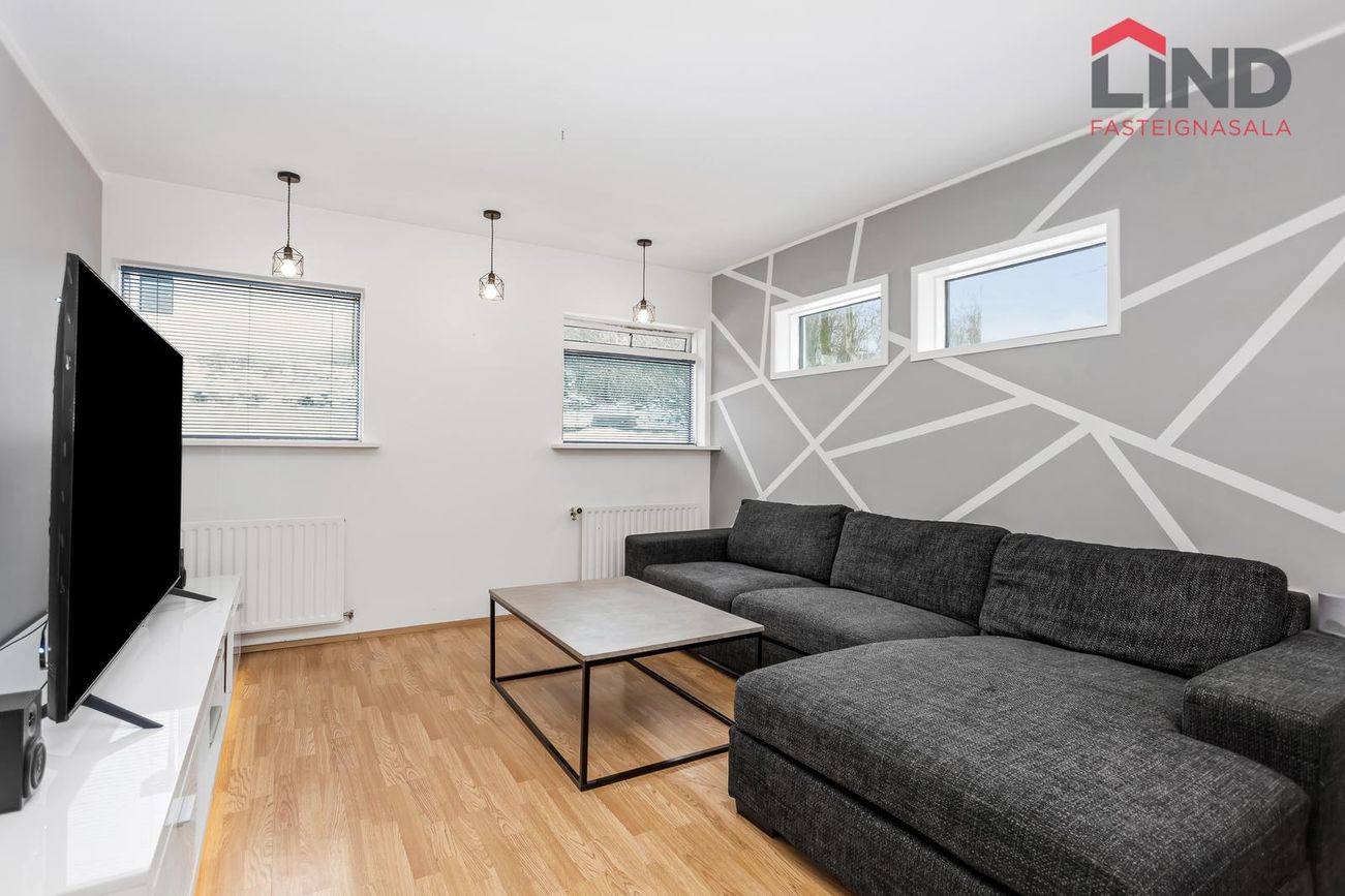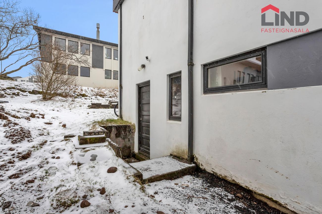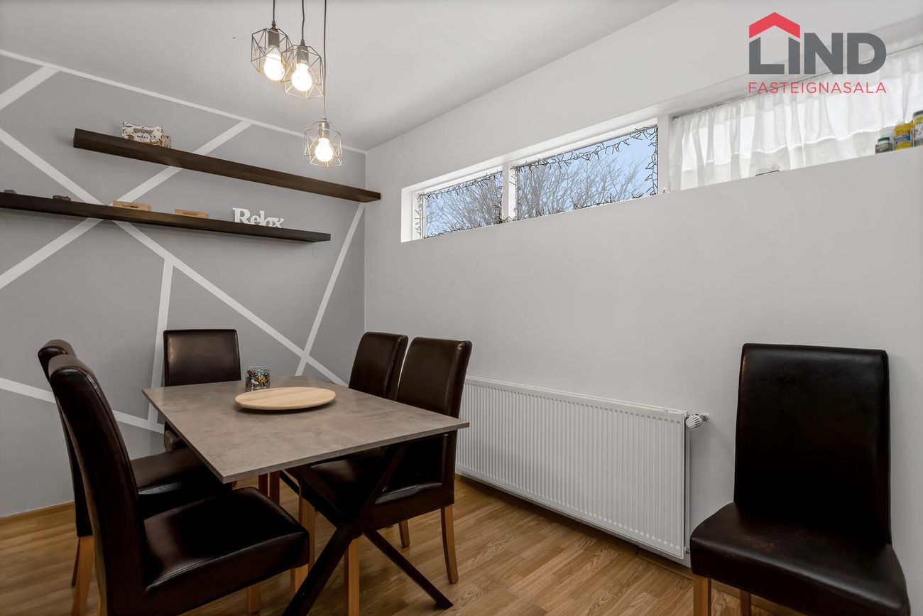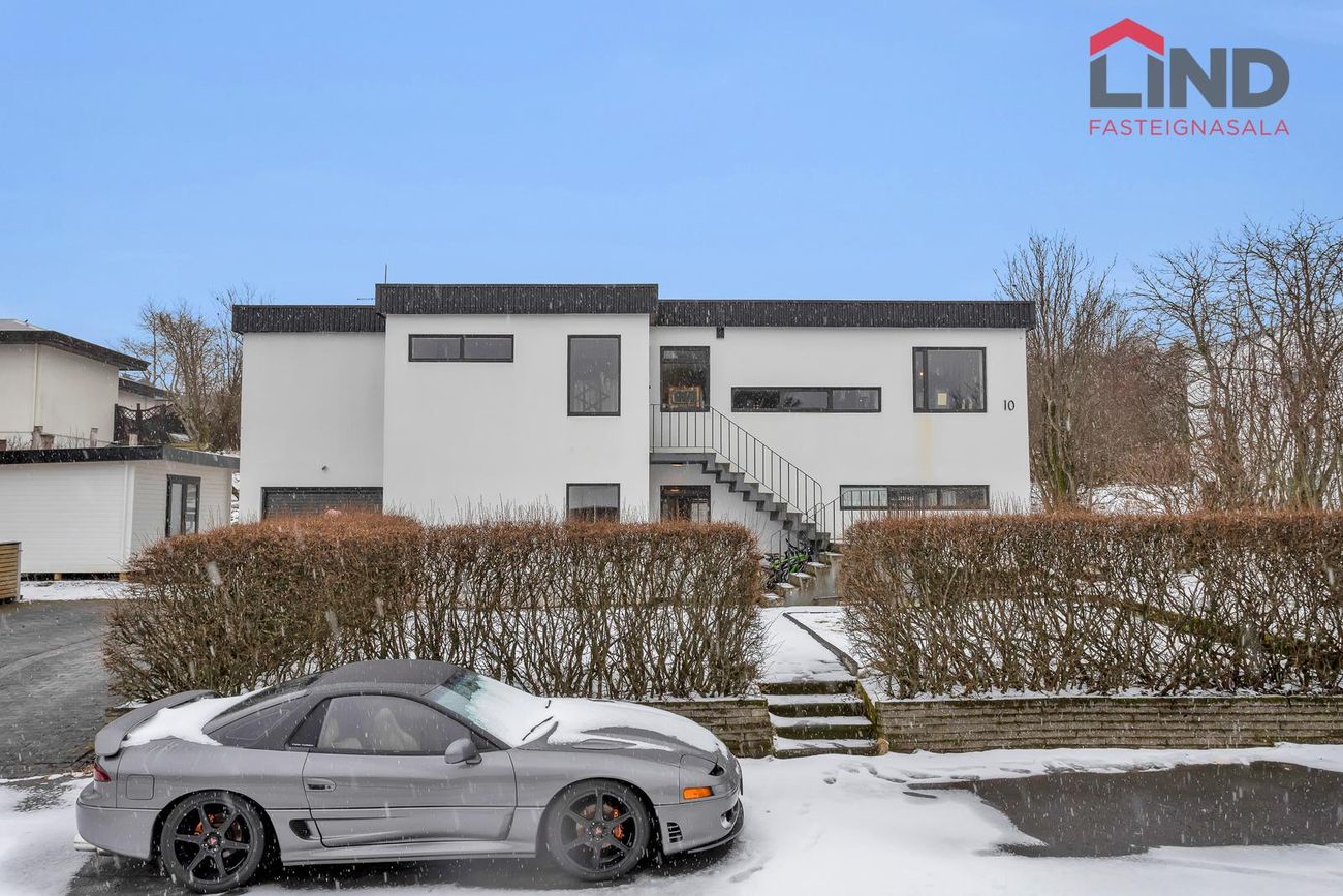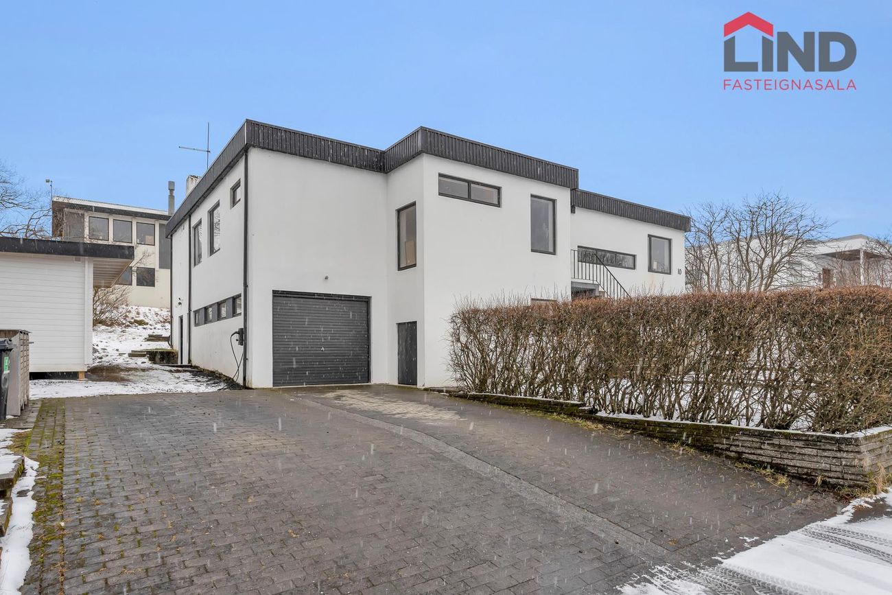 Efri hæð með þremur svefnherbergjum, eldhúsi og stofu/borðstofu. Neðri hæð með bílskúr, þvottahúsi og aukaíbúð með sérinngangi.