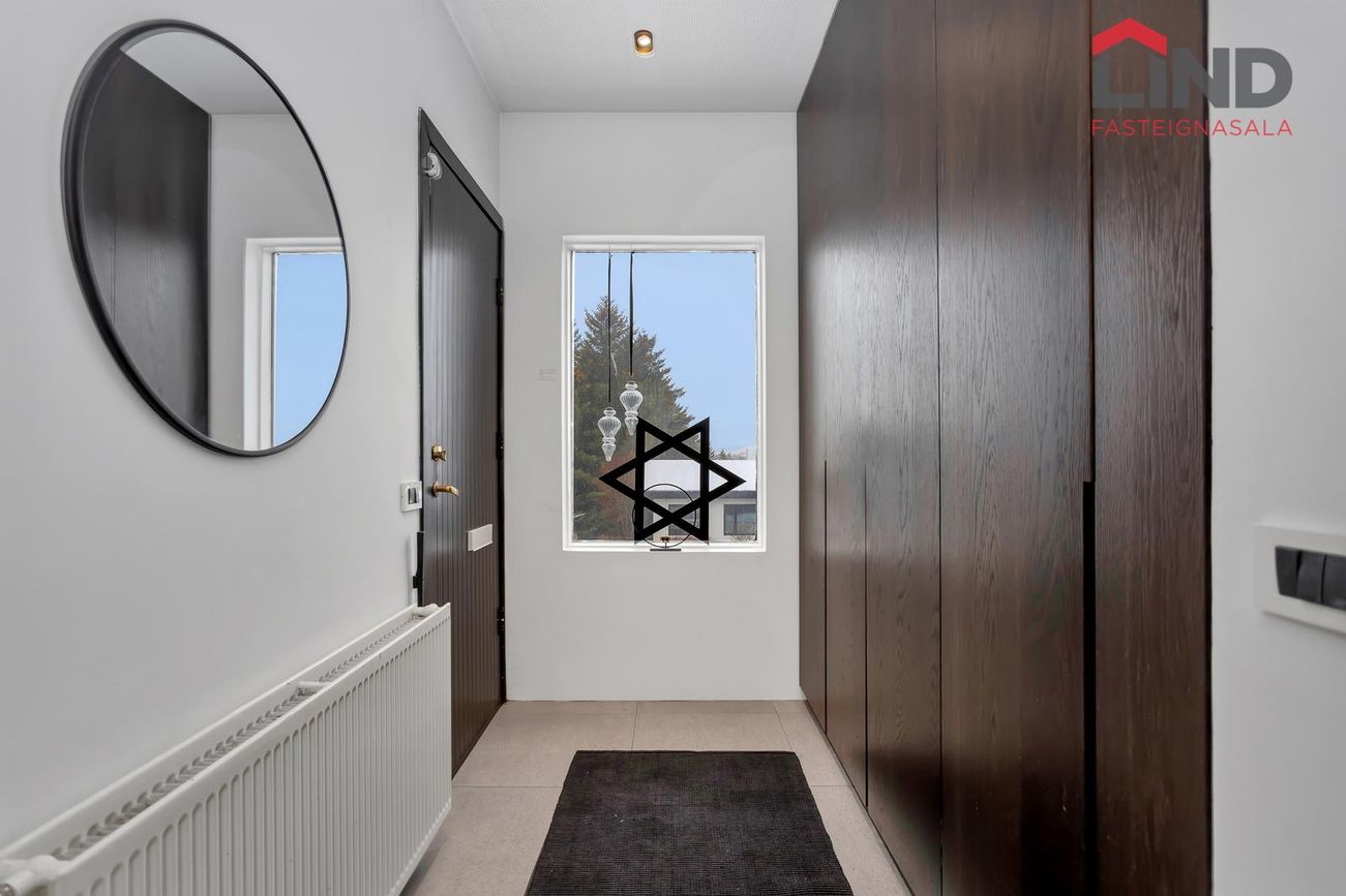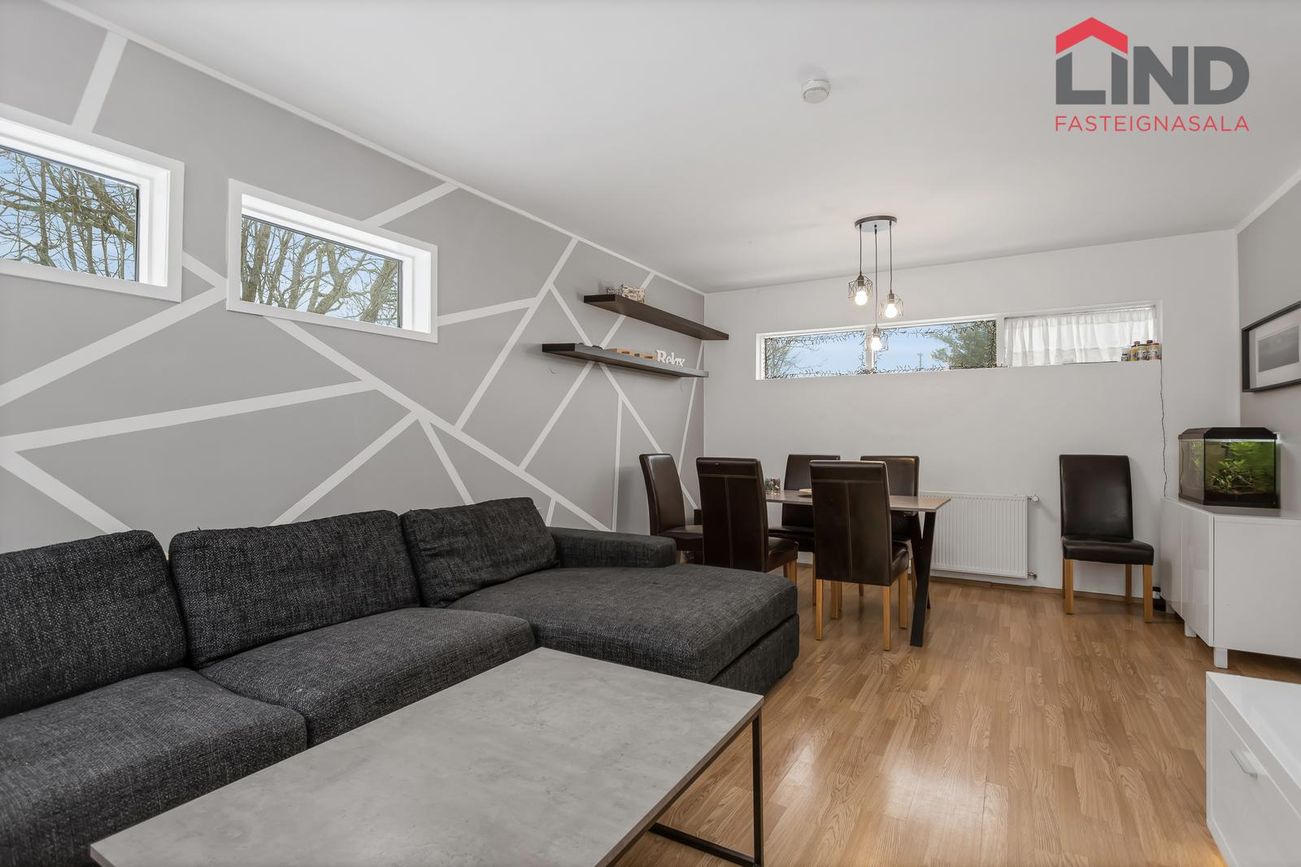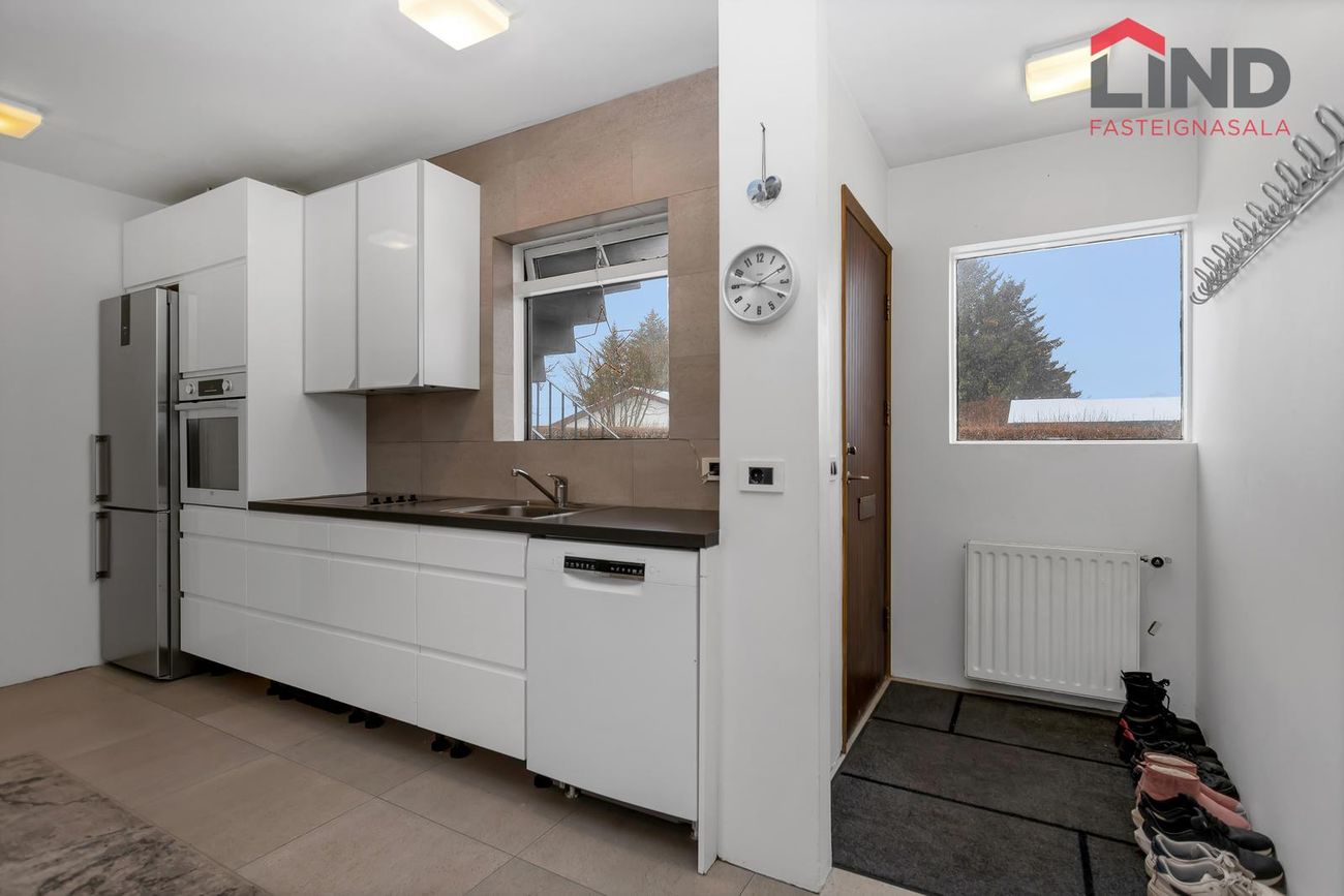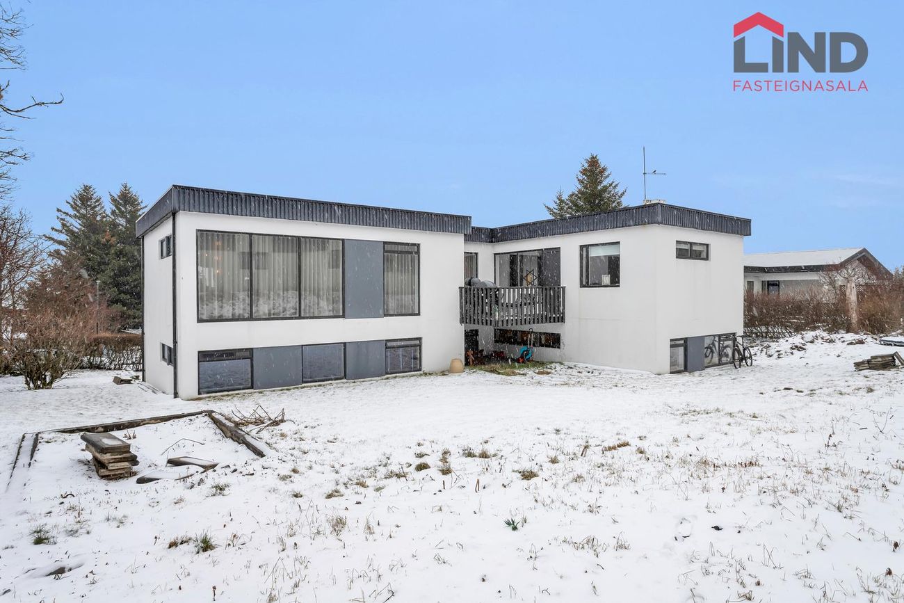 Efri hæð með þremur svefnherbergjum, eldhúsi og stofu/borðstofu. Neðri hæð með bílskúr, þvottahúsi og aukaíbúð með sérinngangi.