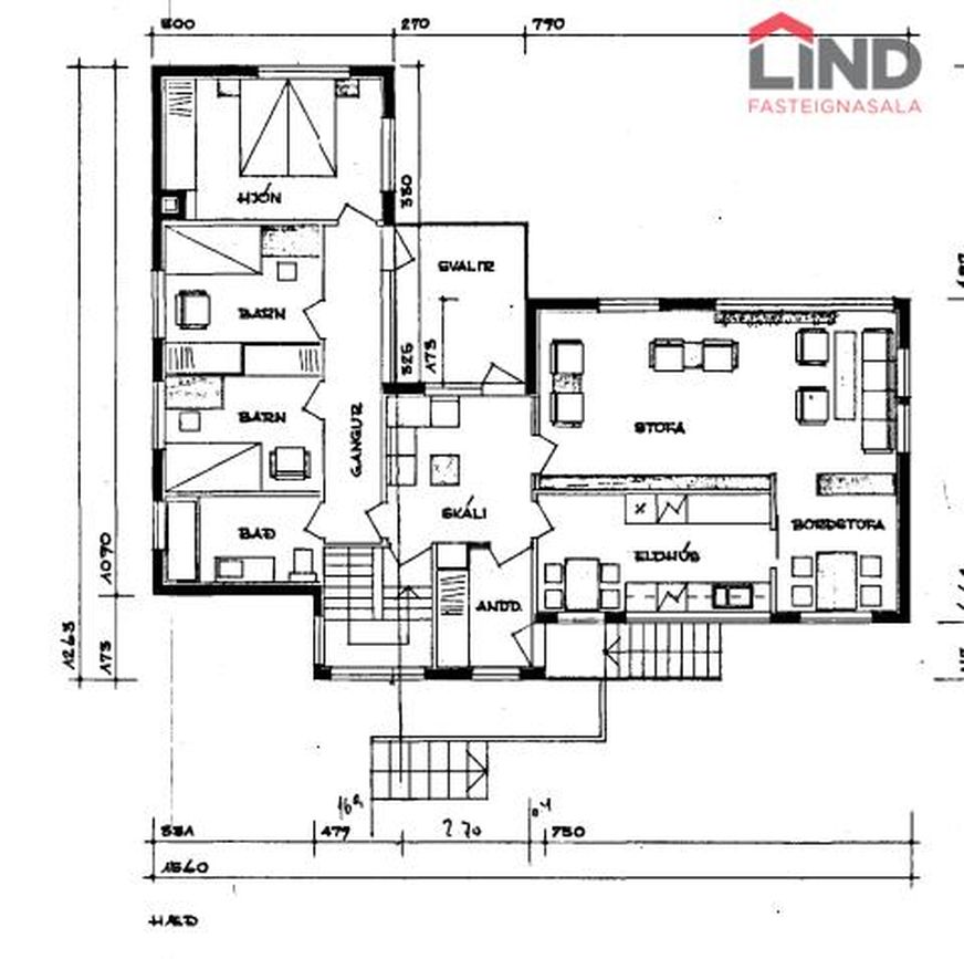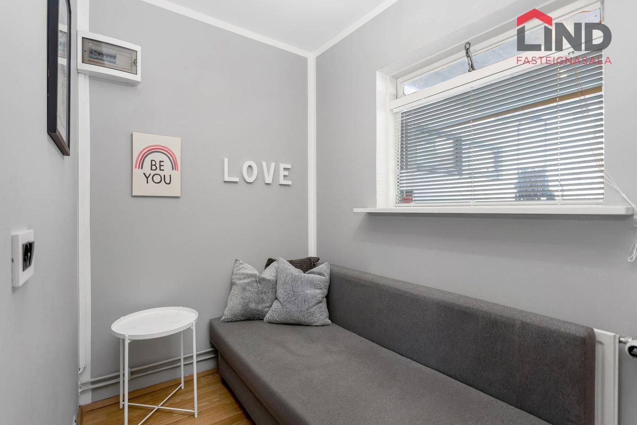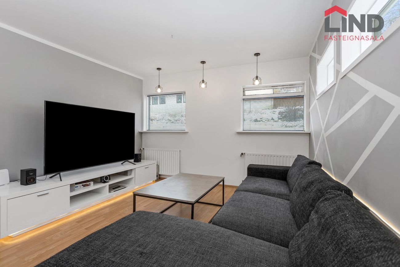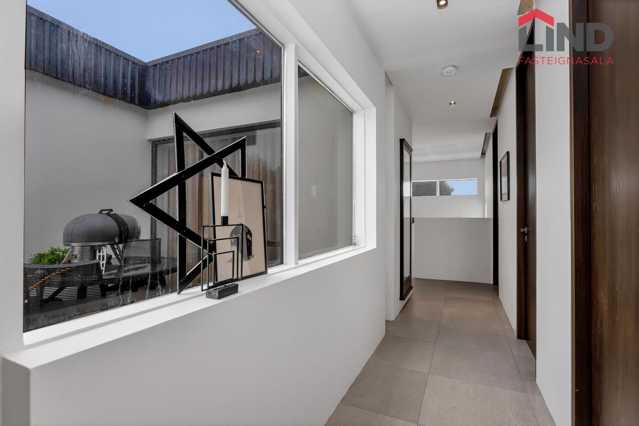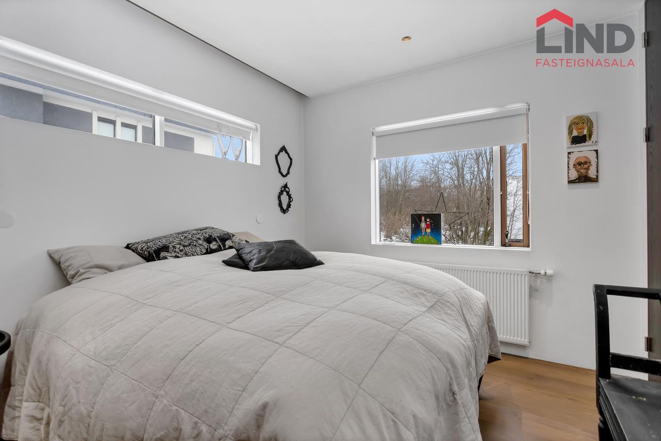 Efri hæð með þremur svefnherbergjum, eldhúsi og stofu/borðstofu. Neðri hæð með bílskúr, þvottahúsi og aukaíbúð með sérinngangi.