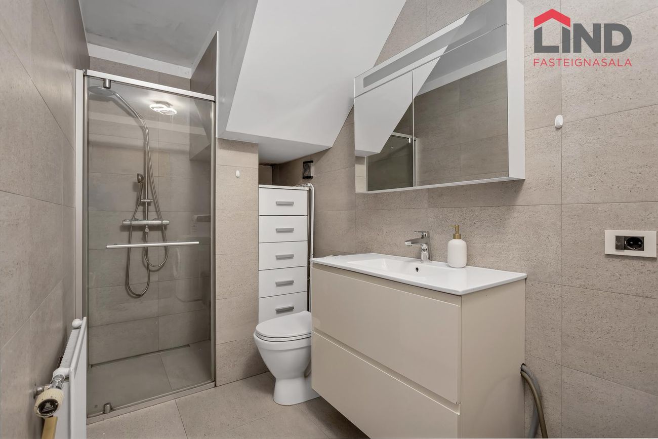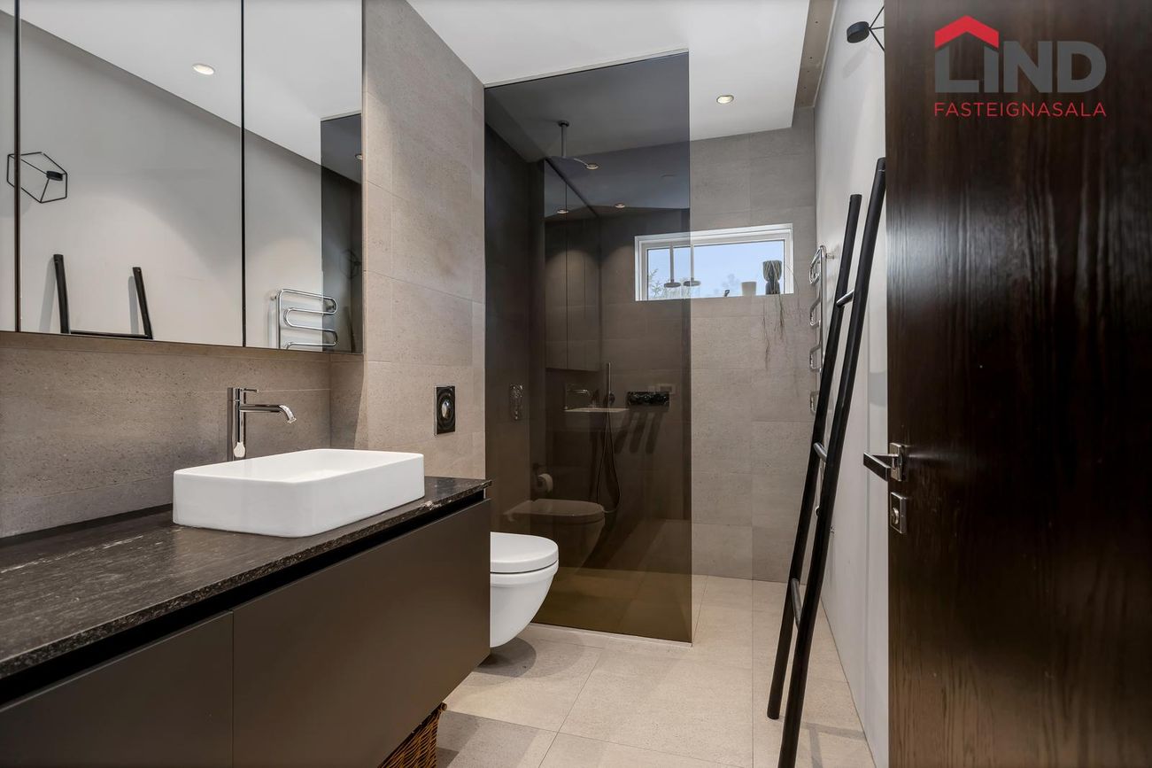 Baðherbergi með vandaðri innréttingu, speglaskáp, handklæðaofni, upphengdu salerni og sturtu með reyklituðu sturtugleri.