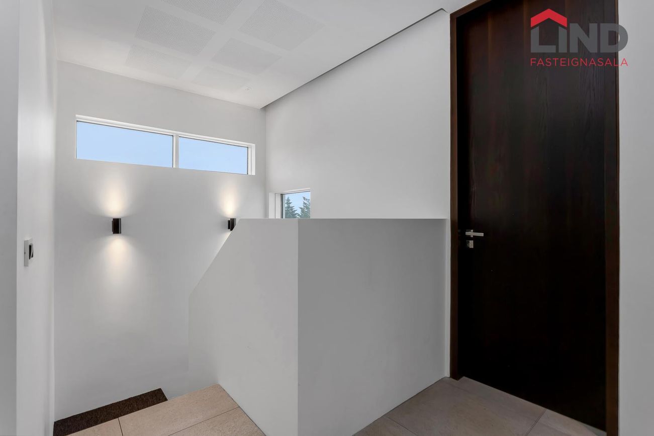 Bílaplan með snjóbræðslu, göng úr lofti til að auka hljóðvist og innfelld lýsing í lofti.