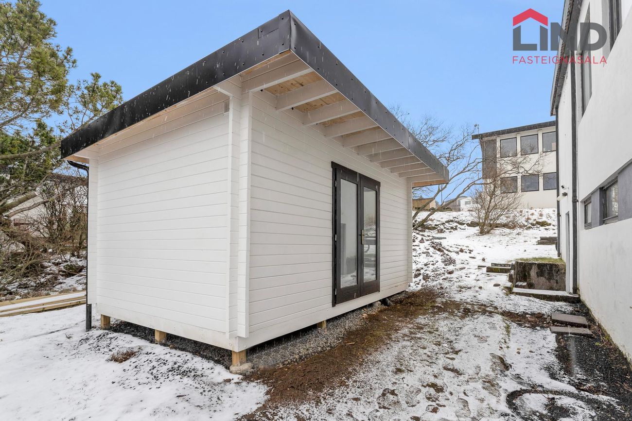 25,2 m² bílskúr með rafmagni, heitu og köldu vatni og epoxy gólfefni.