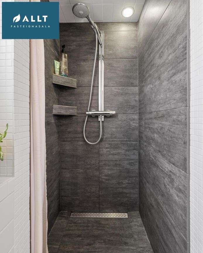 Glæsilega flísalagt baðherbergi með upphækkuðu walk-in sturtu og viðarinnréttingu.