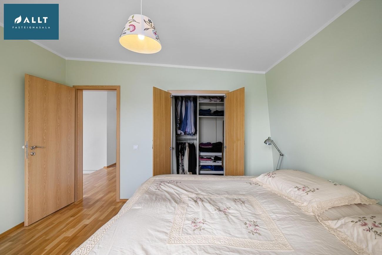 Hjónaherbergi með parketi og svalir, tvö björt barnaherbergi með fataskáp og eitt stórt herbergi með tveimur gluggum.