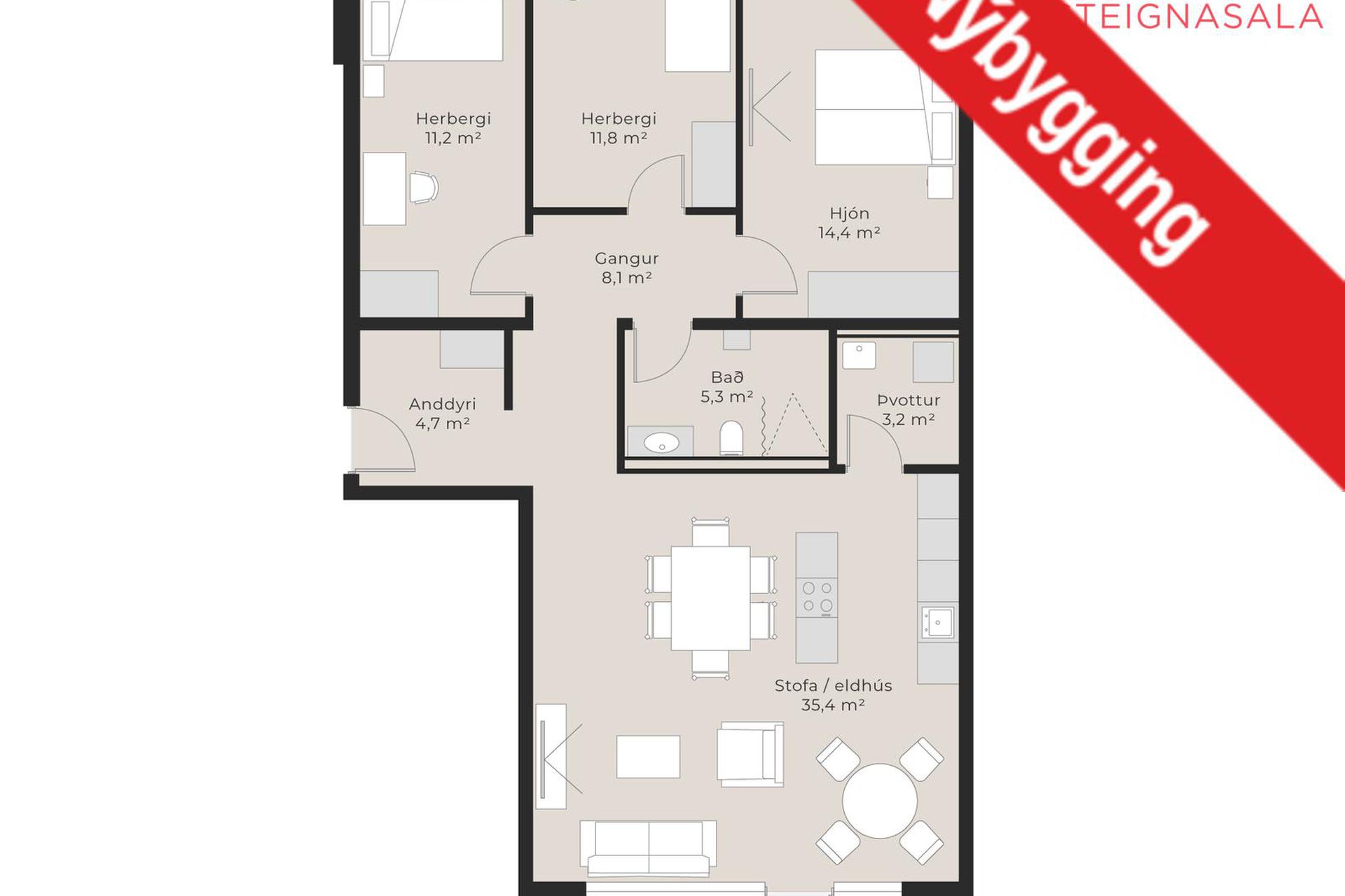| 4 | 148,40 m² | 129.900.000 kr. 27. apríl 2026 | 118.900.000 kr. 1. júní 2022 |