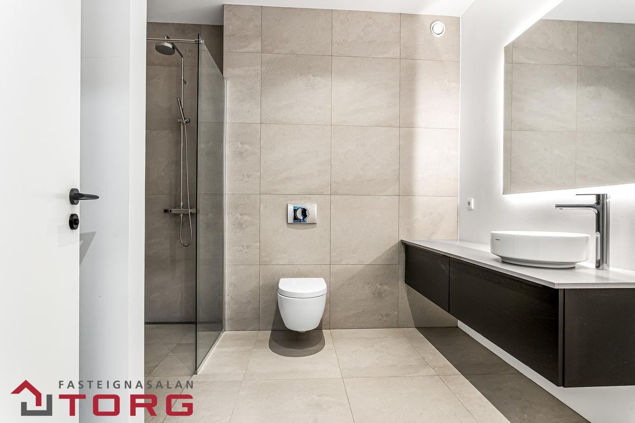 Á baðherbergi og þvottahúsi eru fallegar flísar í ljósgráum tón. Blöndunartæki, handlaugar og salerni er frá Tengi, flísar frá Álfaborg.