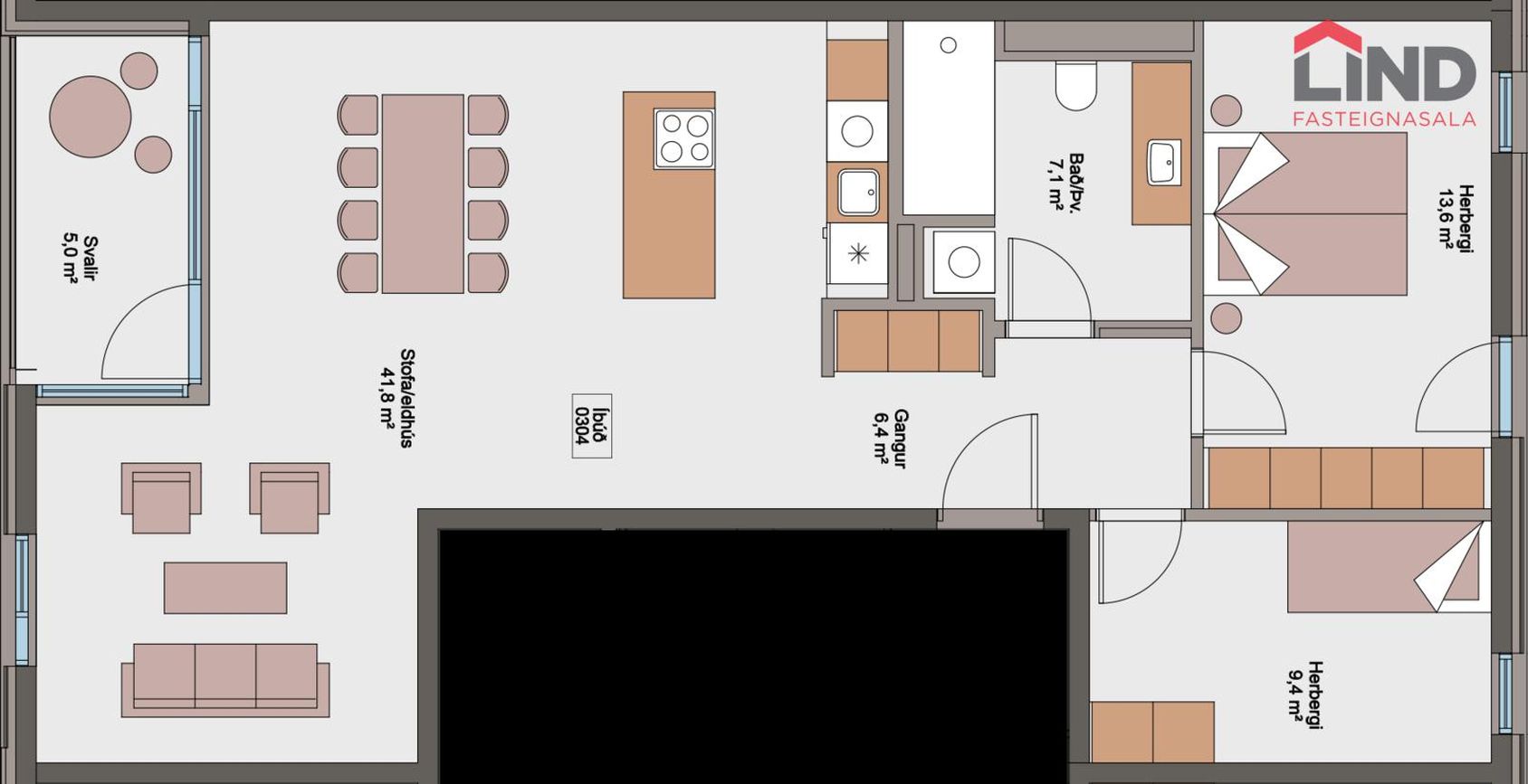 Opið alrými tengt eldhúsi og borðstofu með útigöngu á svalir. Háir loft og gólfsíðir gluggar.