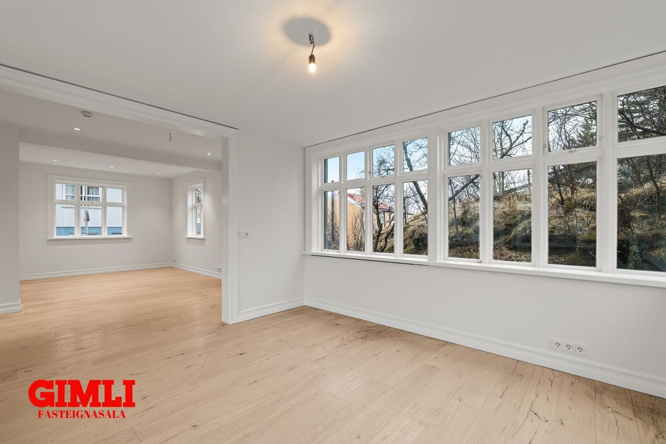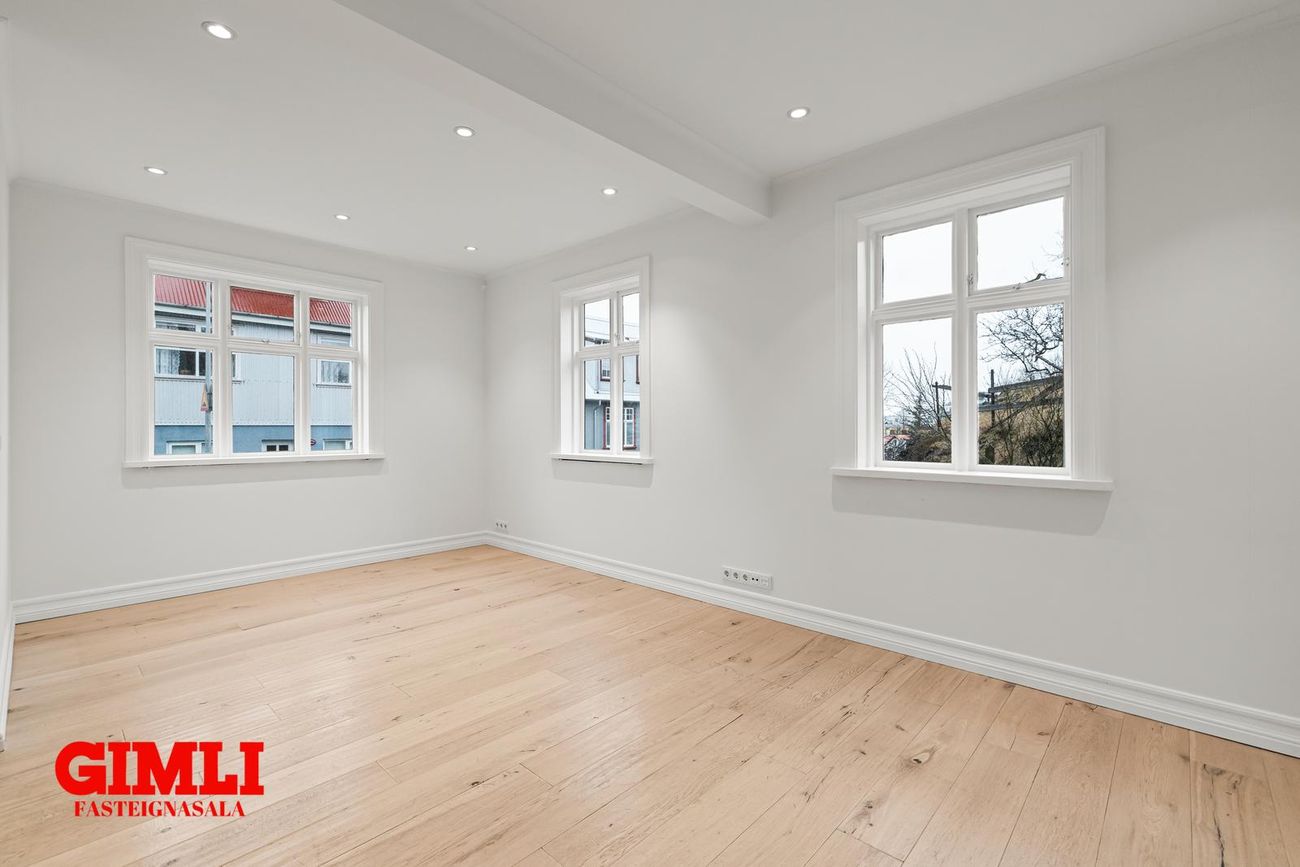 Stofan er rúmgóð og björt með parketi og fallegum gluggum á tvo vegu.