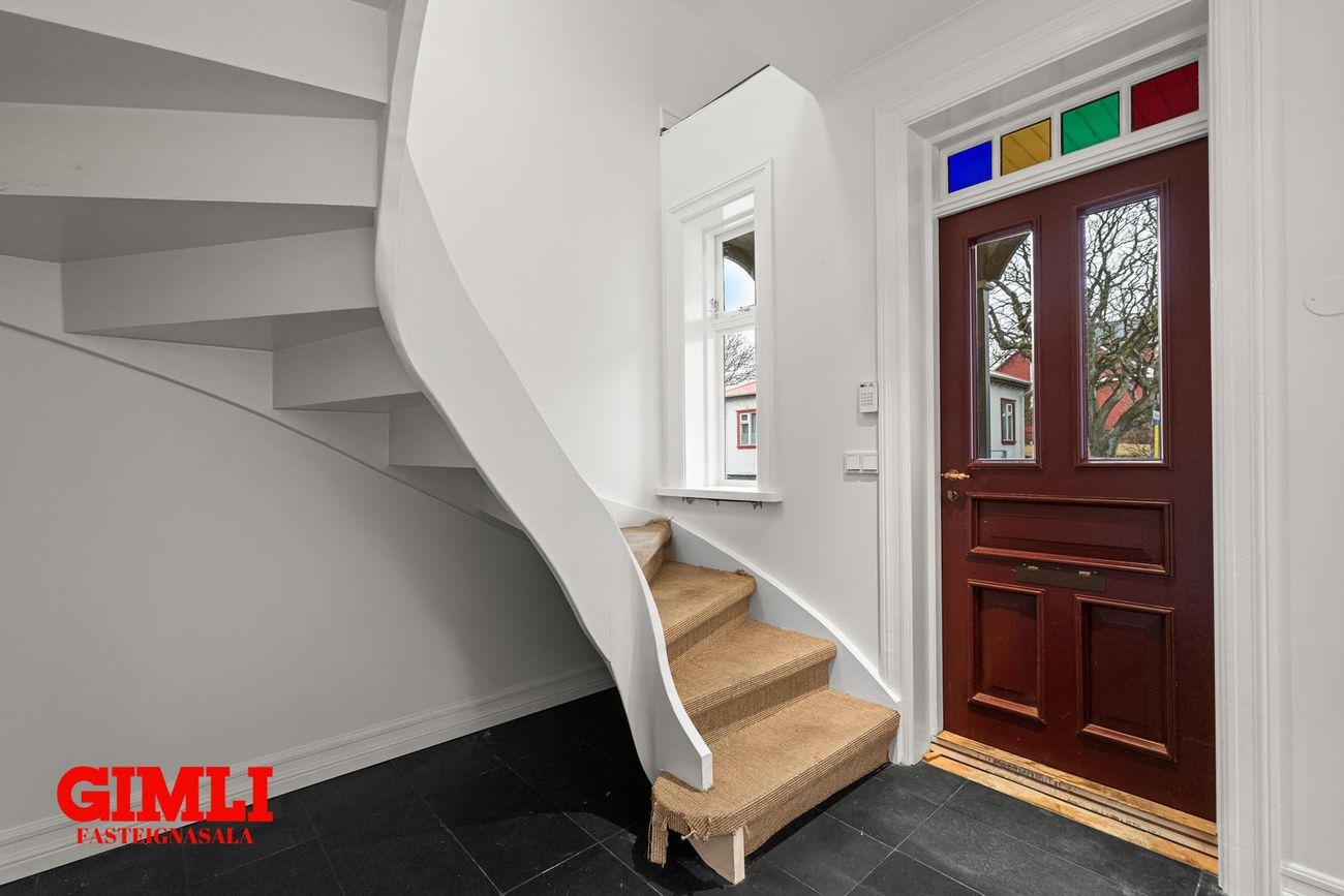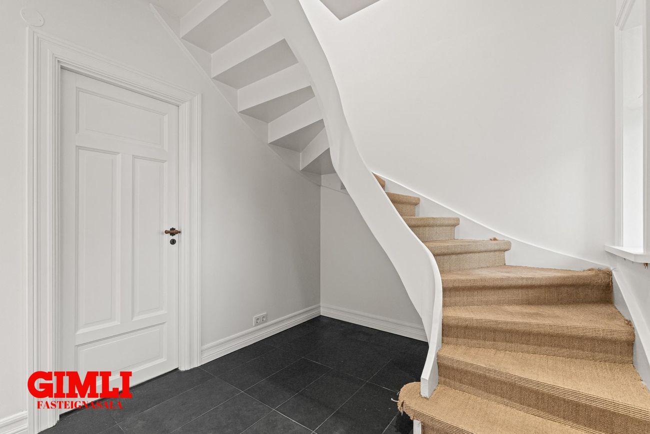 Efri hæðin: Fallegur bogadreginn stigi upp en vantar handrið á stigapallinn.