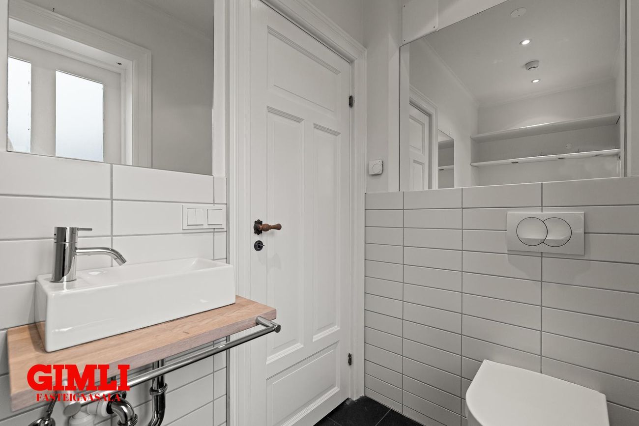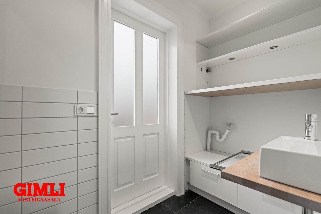 Við hliðina á holinu er gesta snyrting með flísum á gólfi og hluta veggja, hurð þaðan út í bakgarðinn. Tengi fyrir þvottavél og þurrkara í þar til gerðri innréttingu.