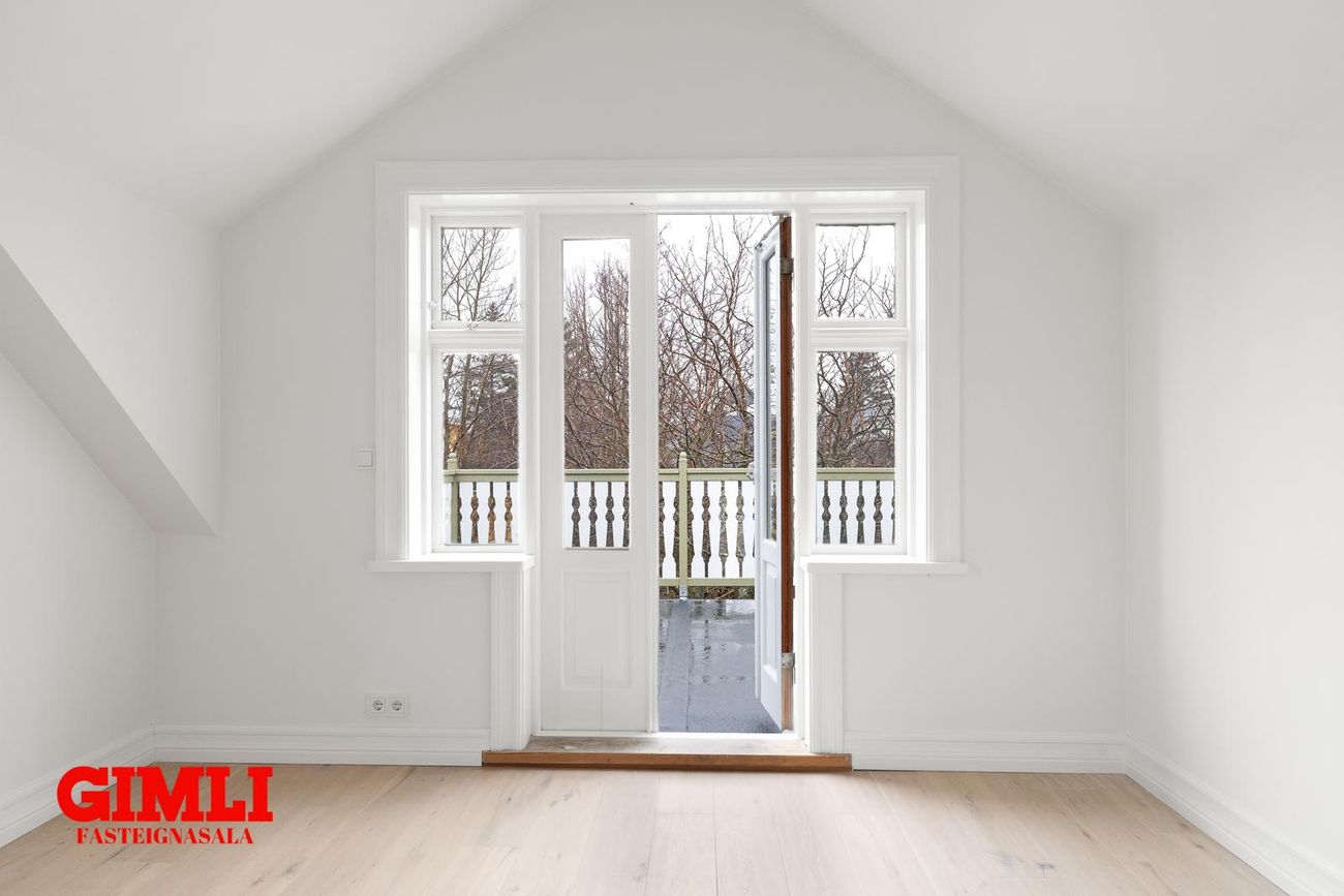 Einstaklega fallegir gluggar og útskornar gluggaáfellur utandyra ásamt því að haldið hefur verið í stíl tréverks fyrri tíma í bland við nútímaútlit.
