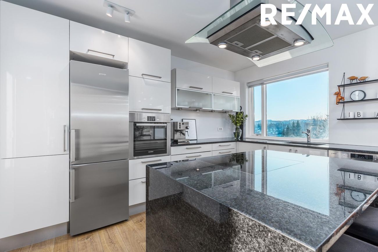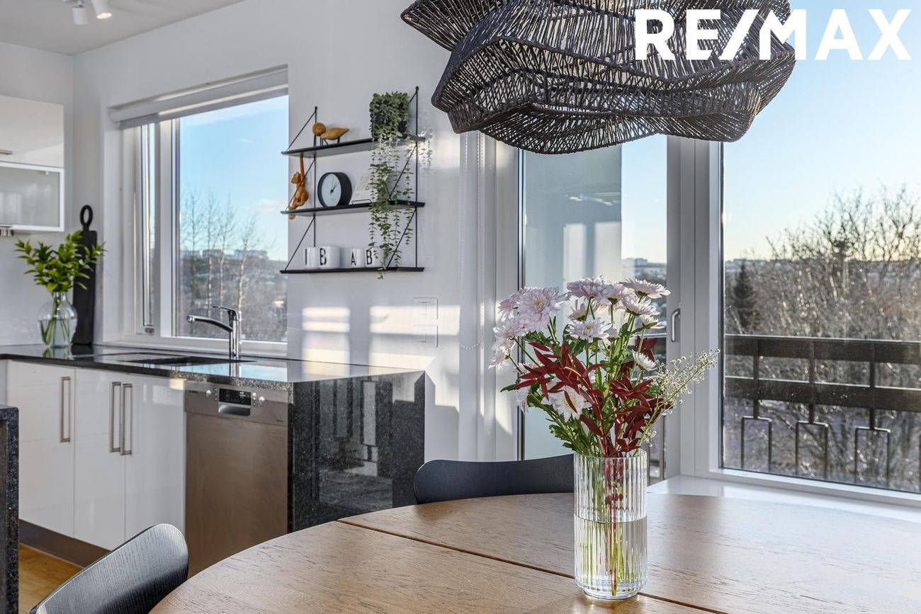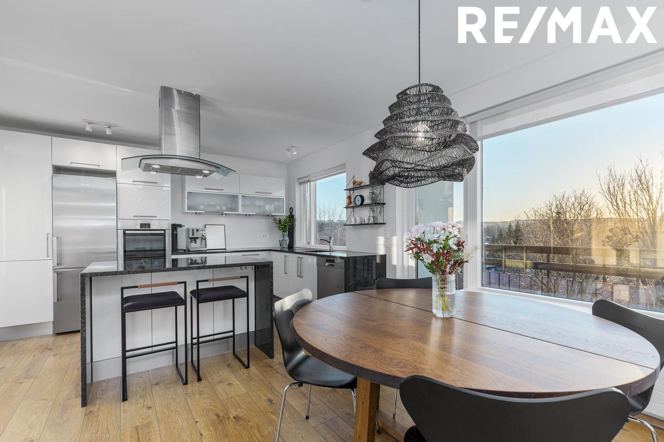 Opið eldhús með eyju, granít borðplötu, vönduðu helluborði og viftu. Gott skápapláss og parket á gólfum. Uppþvottavél fylgir. Í sameiginlegu rými með stofu/borðstofu.