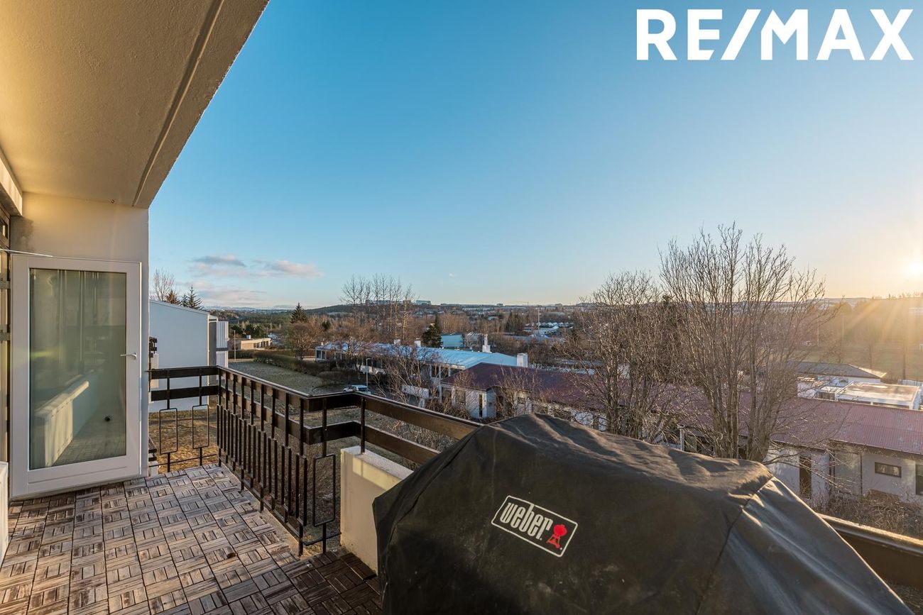Mjög rúmgóðar svalir út frá stofu með glæsilegu útsýni til suðurs. Með nýrri svalarhurð og sólvarnargleri (2025).