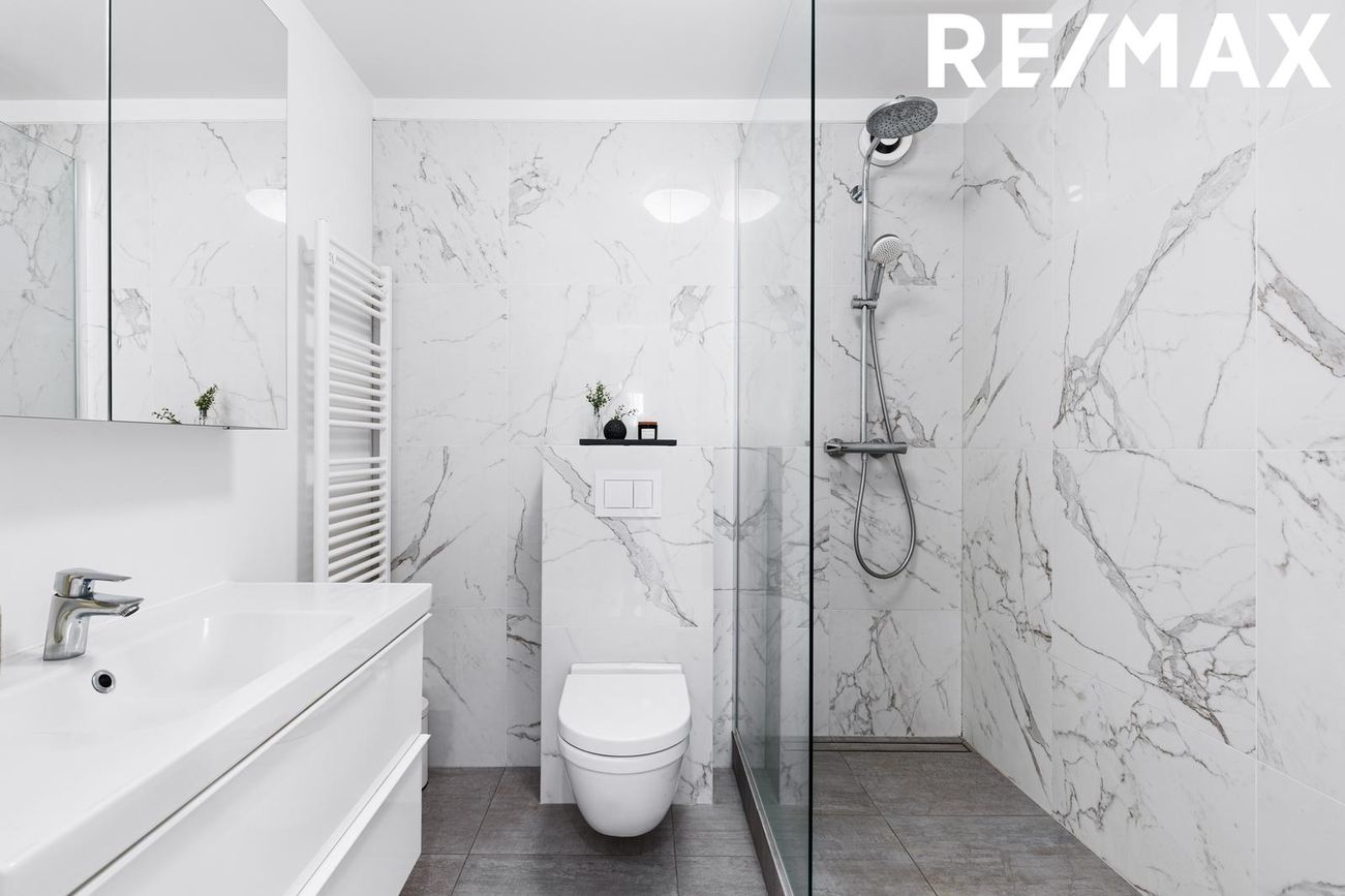 Flísalagt baðherbergi með sturtu, upphengdu salerni og handlaug með góðu skápaplássi. Endurnýjað 2020 með walk-in sturtu, nýjum handklæðaofni, nýrri rafmagnsviftu í lofttúðu, nýrri innrétting og nýju blöndunartæki.