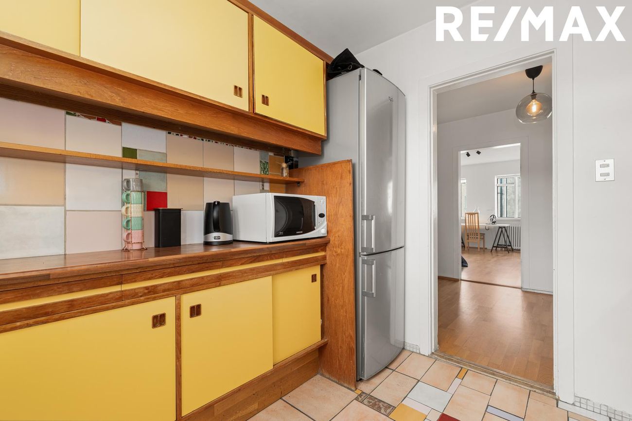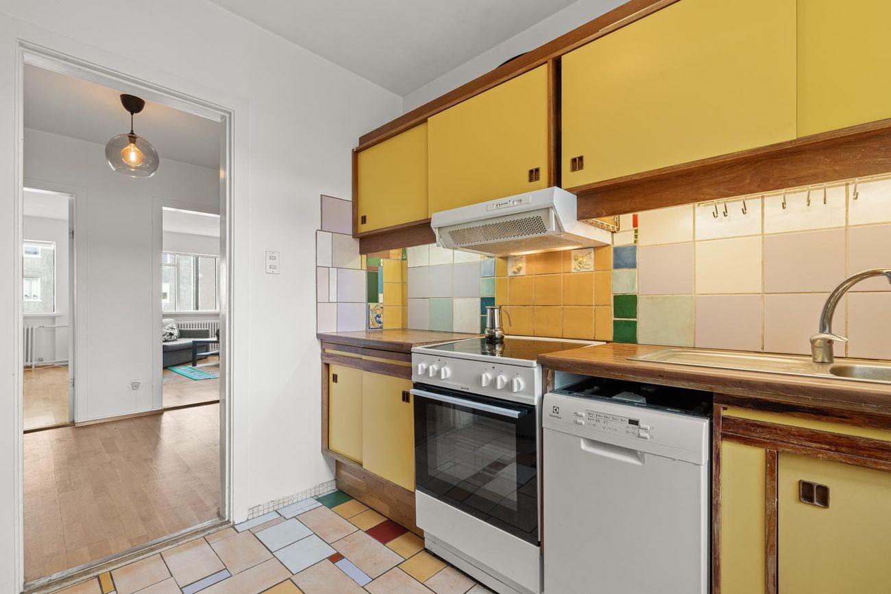 Eldhús er með retro innréttingu á tveimur veggjum. Milli efri og neðri skápa eru flísar, sem og á gólfi. Ofn með helluborði og vifta fyrir ofan. Stæði fyrir uppþvottavél og ísskáp.