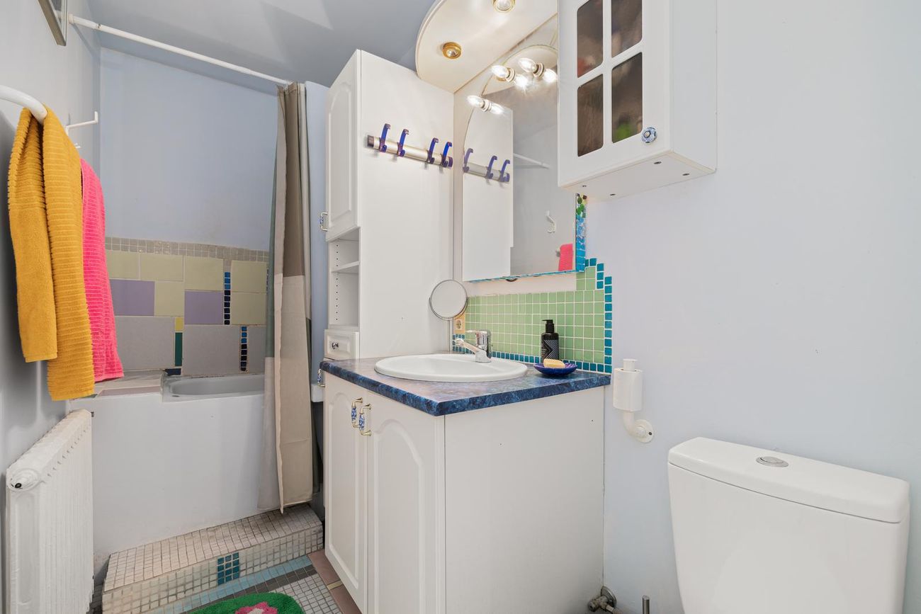 Baðherbergi er með hvítri innréttingu. Veggfestur spegill með ljósi. Baðkar með sturtu.