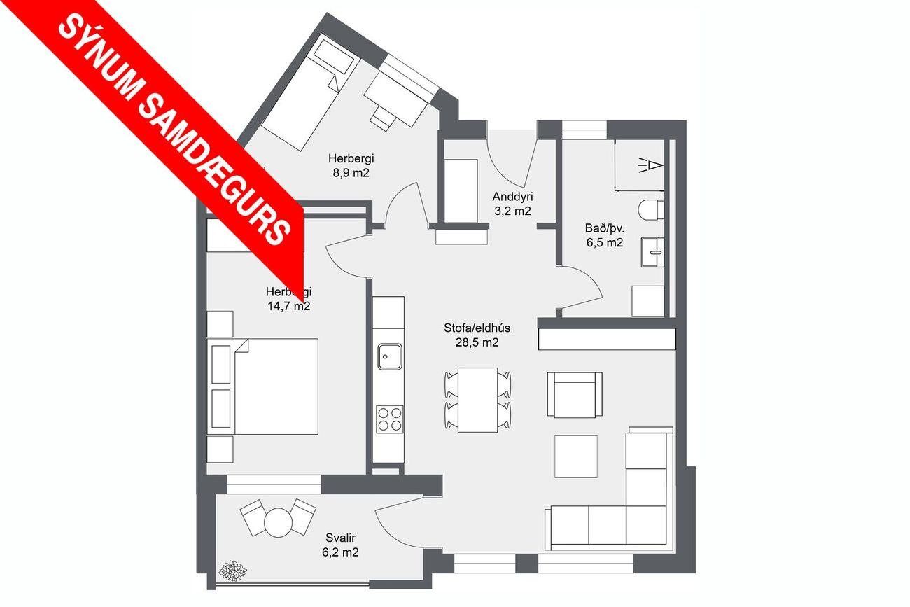 | 2 | 65,10 m² | 64.900.000 kr. 8. febrúar 2024 | 64.900.000 kr. 26. febrúar 2024 |