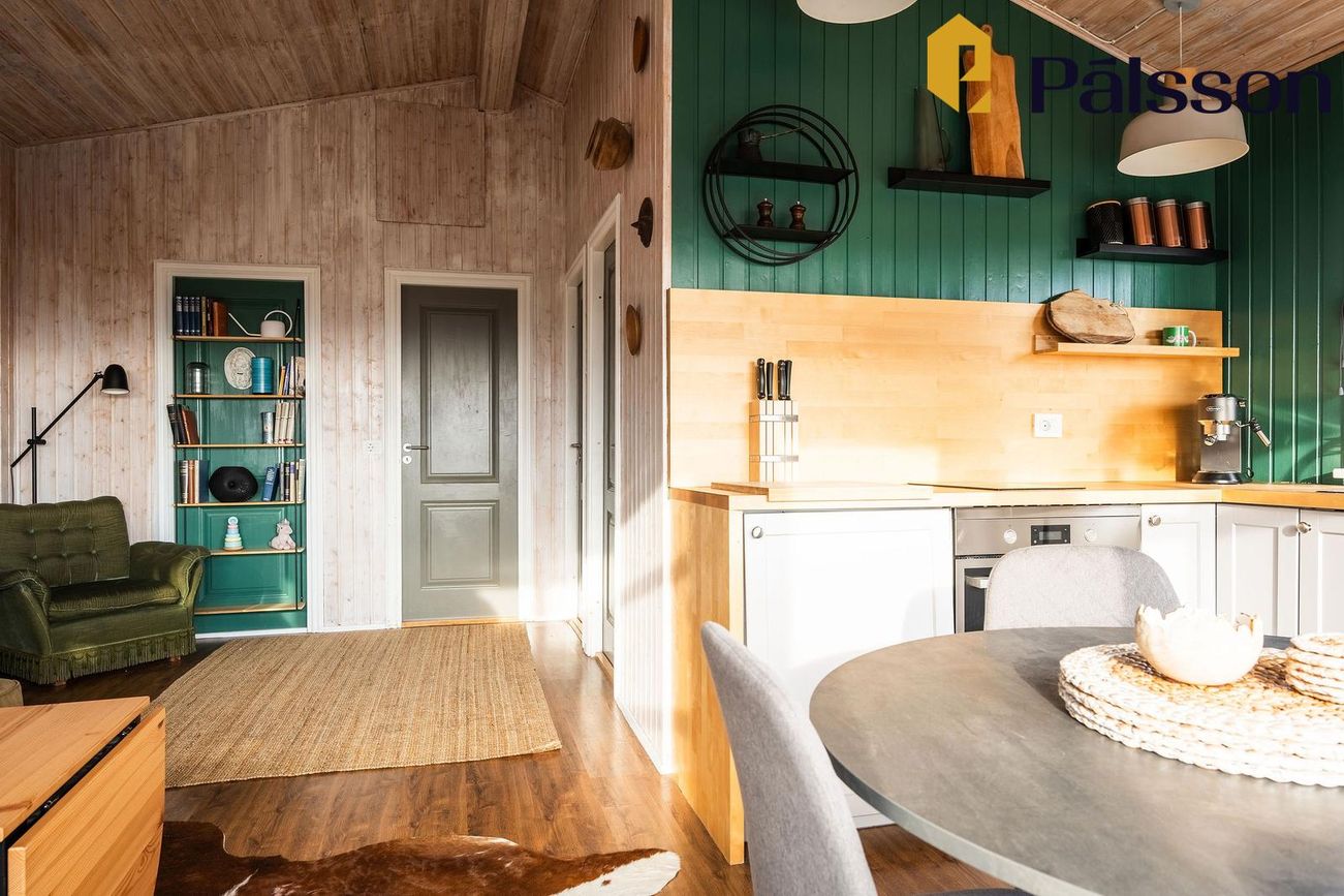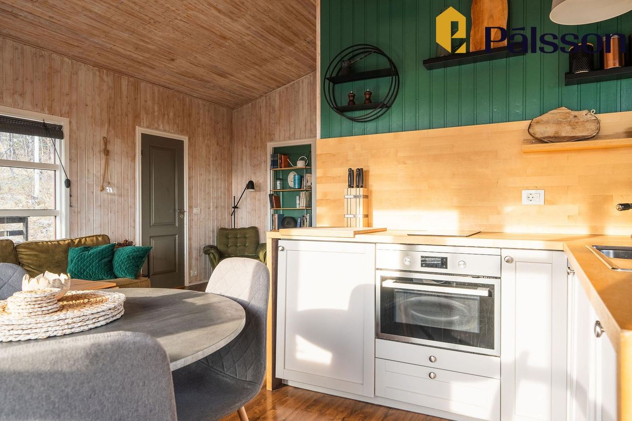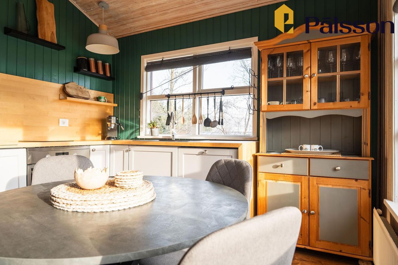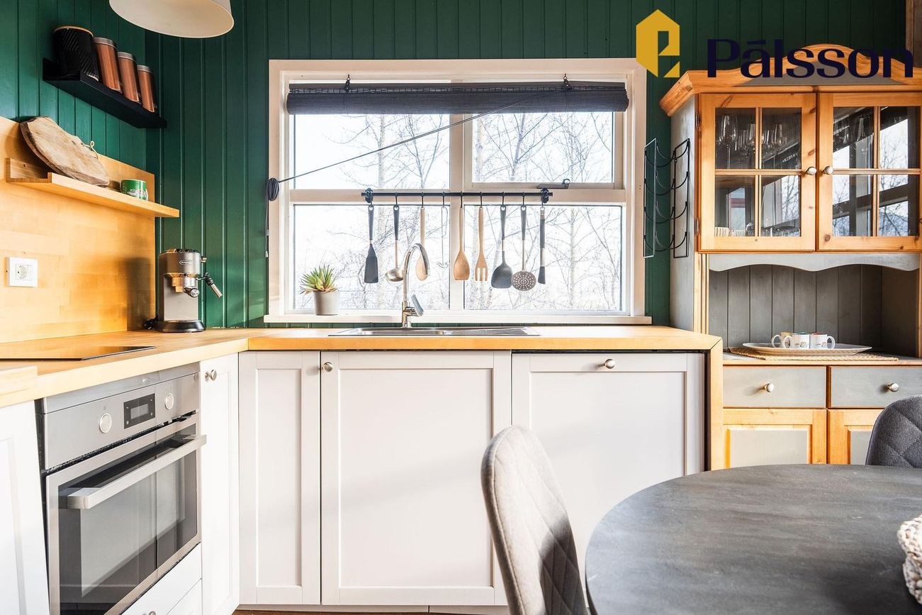 Fín eldhúsinnrétting með hurð út á sólpall.