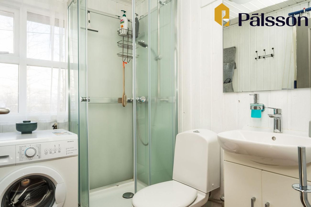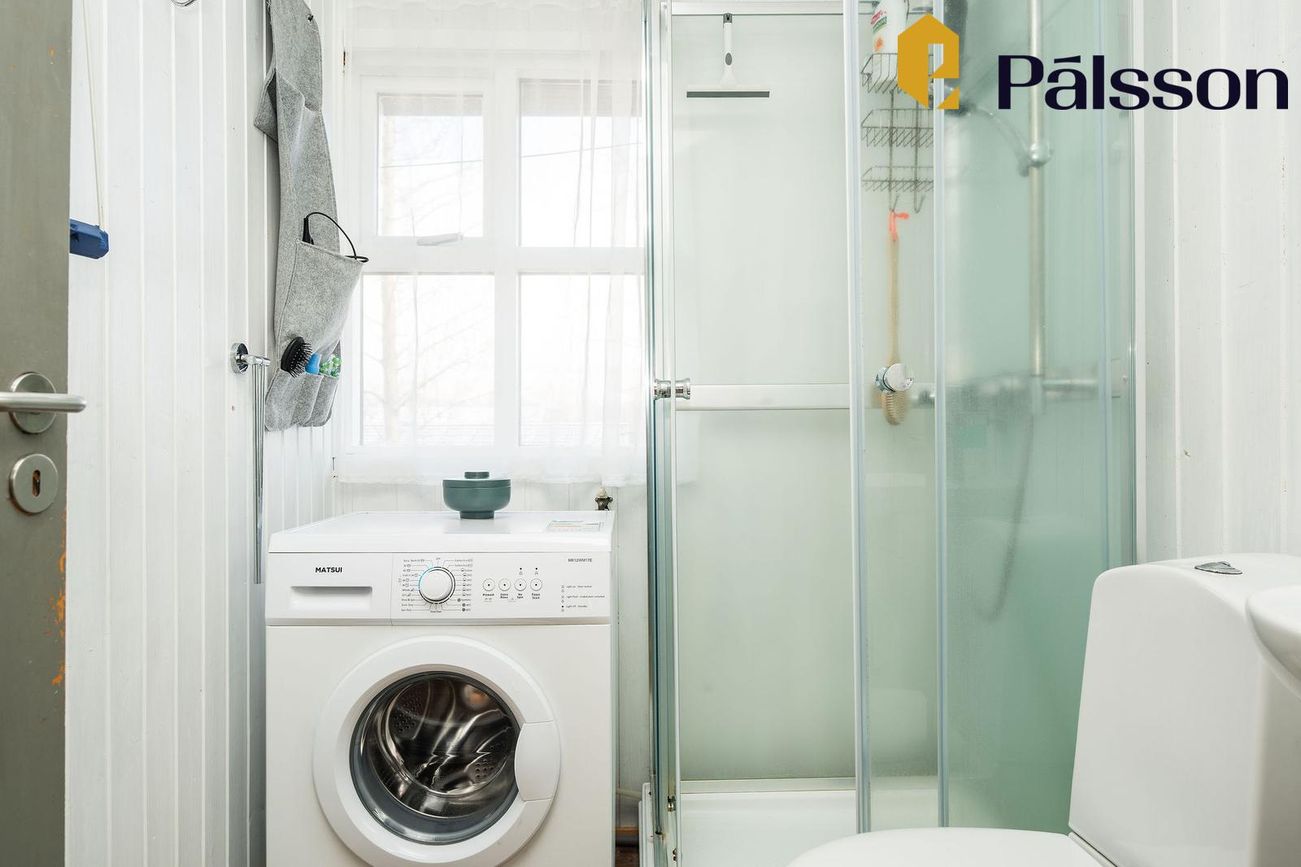 Baðherbergi með sturtu og tengi fyrir þvottavél.
