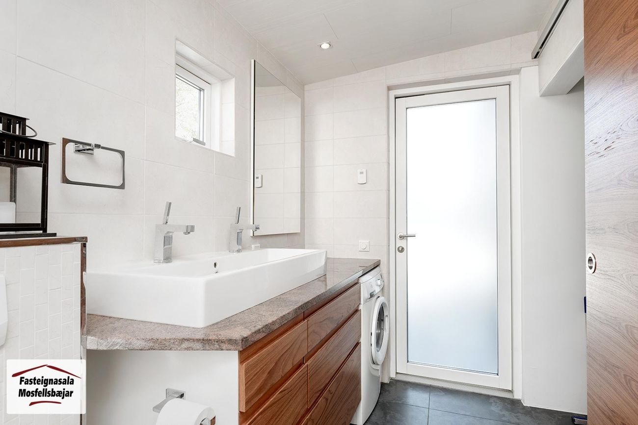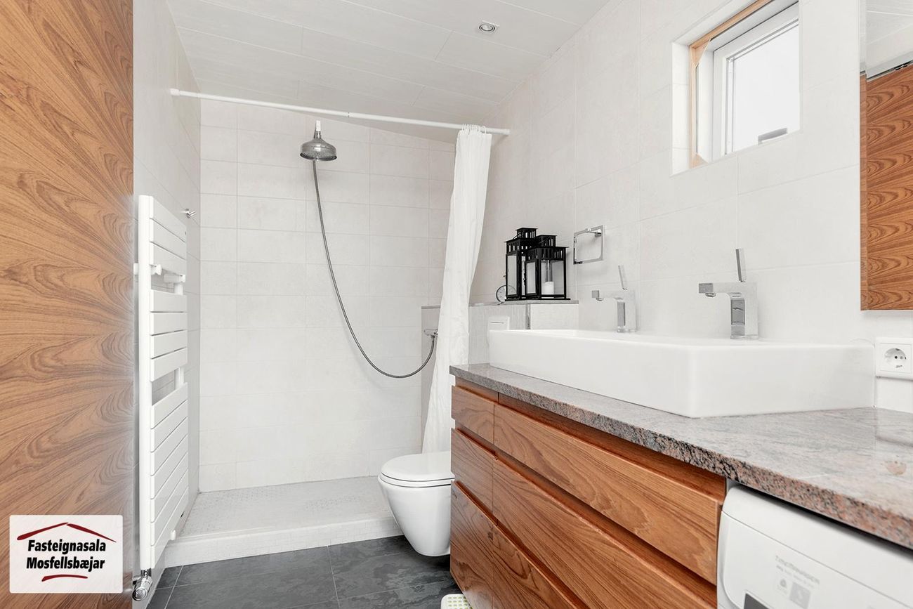 Flísað baðherbergi með sturtu, tvöföldum vaski, handklæðaofni og þvottavélaðstöðu. Þvottavél getur fylgt með.