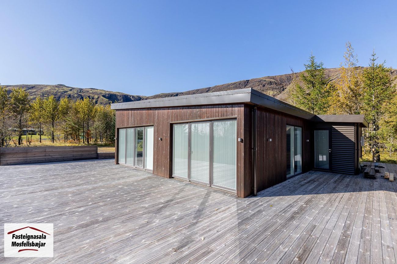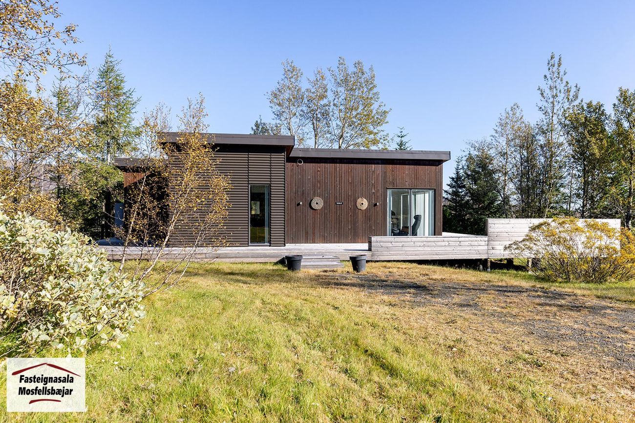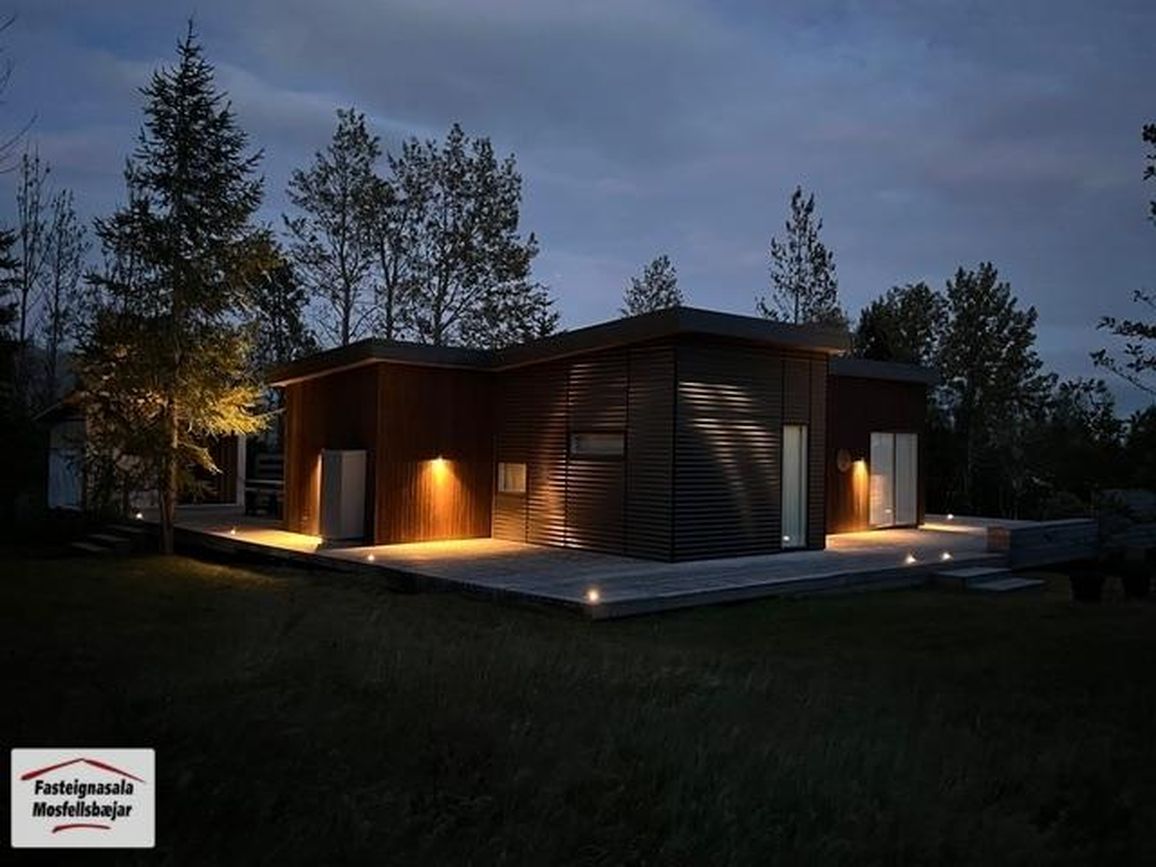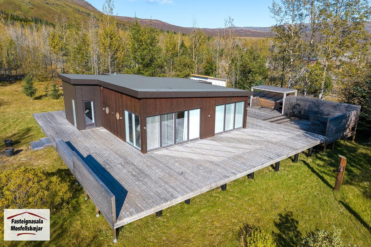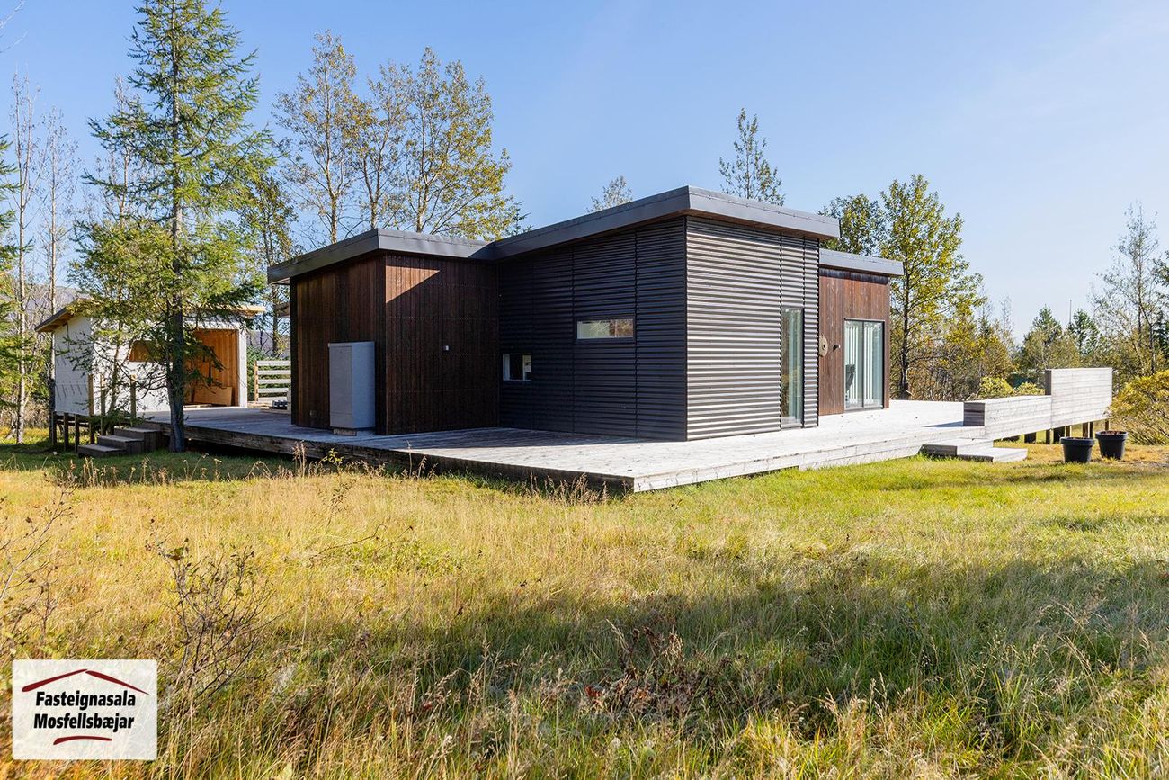 Heilsárshús/sumarhús með opnu rými, timburverönd og náttúrunálægð. Innfelld lýsing, góð lofthæð og Danfoss hitastýring.