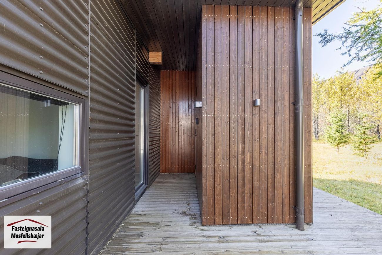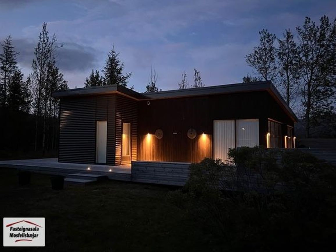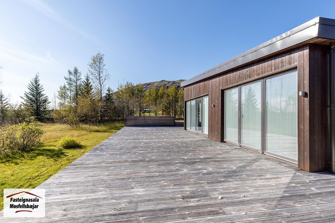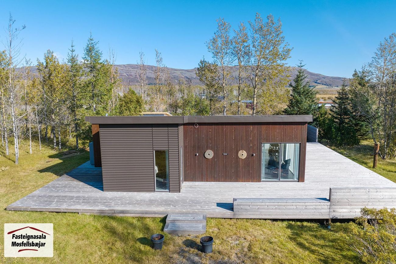 Heilsárshús/sumarhús með opnu rými, timburverönd og náttúrunálægð. Innfelld lýsing, góð lofthæð og Danfoss hitastýring.