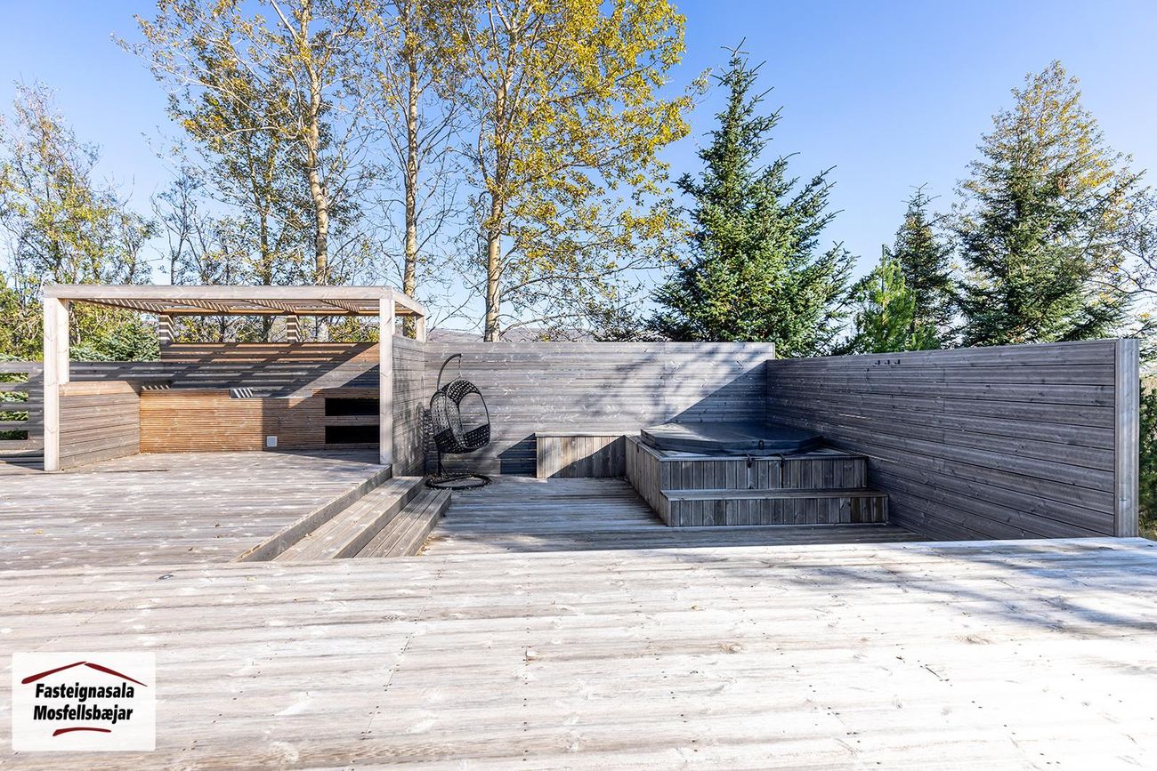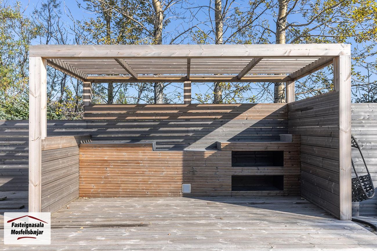 300 m2 timburverönd með heitum potti, útieldhúsi og geymsluhúsi.