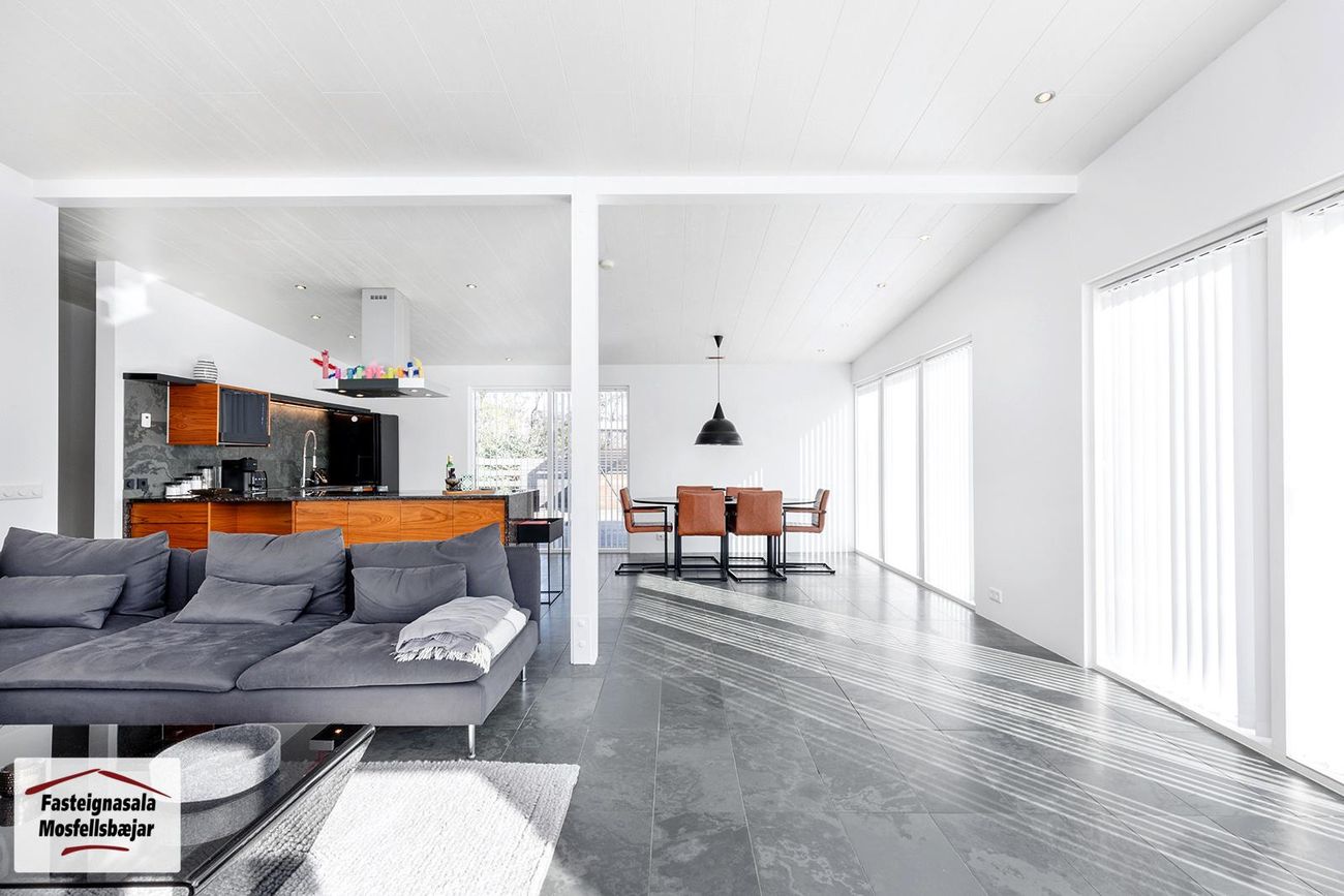 Stórt opið rými með eldhúsi, flísum á gólfi og gólfsíðum gluggum með víðsýnt. Sjónvarpsskjenkur fylgir með.