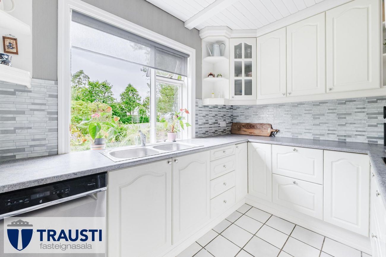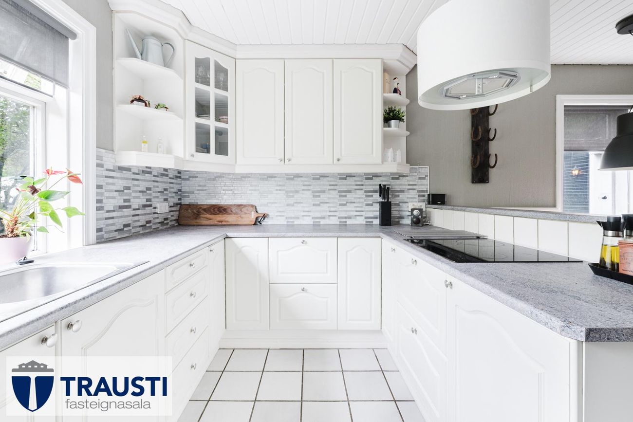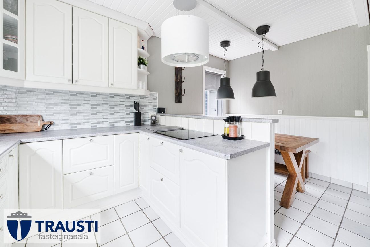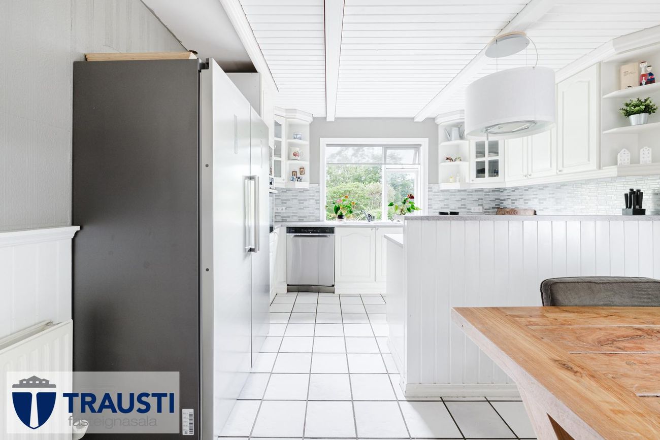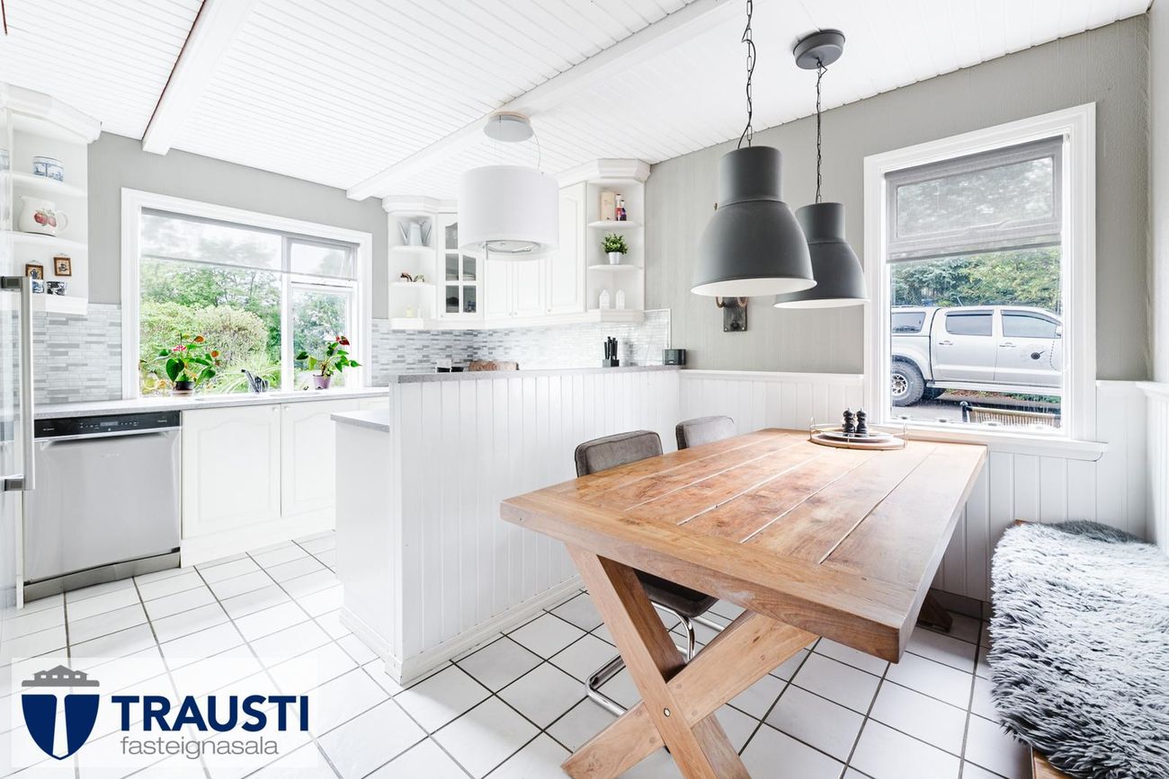 Rúmgott eldhús með hvítri innréttingu, flísalögðu gólfi og borðkrók.