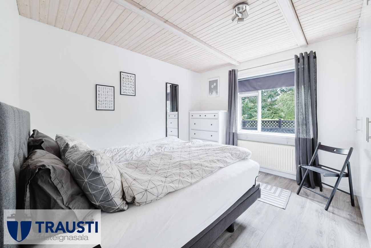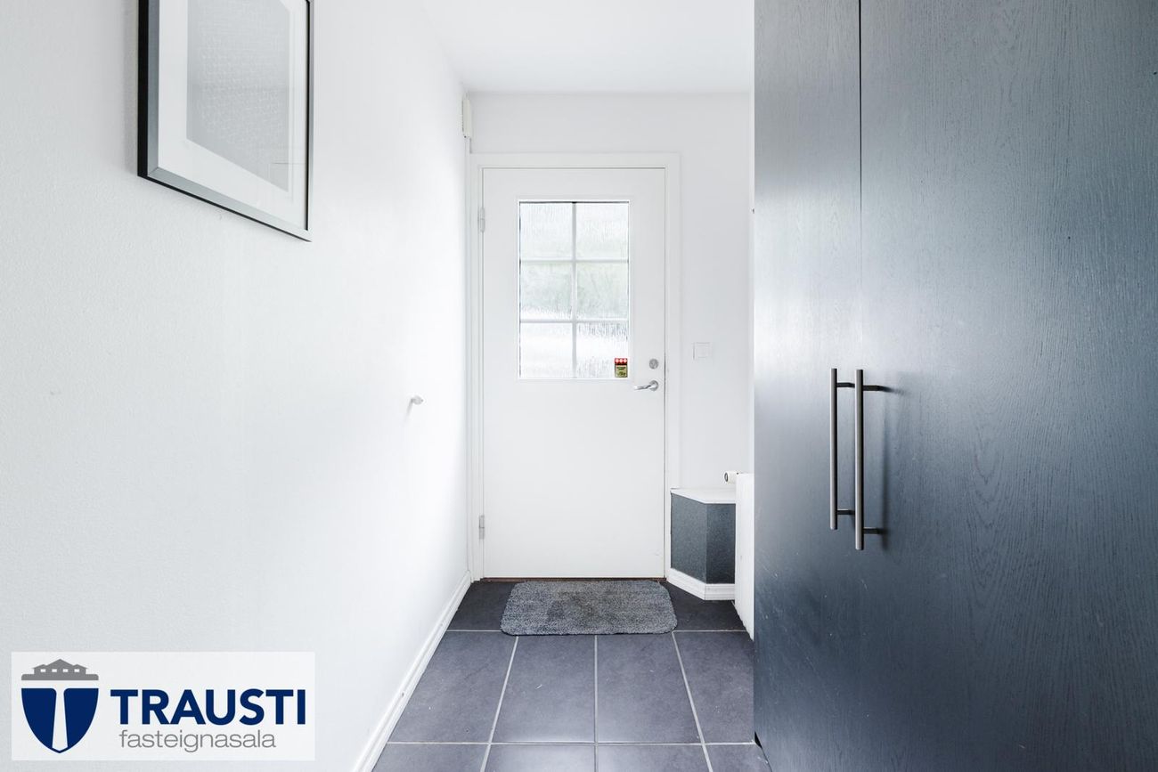 Parketgólf í stofu, flísalagt gólf í eldhúsi og baðherbergi, viðarpallur.