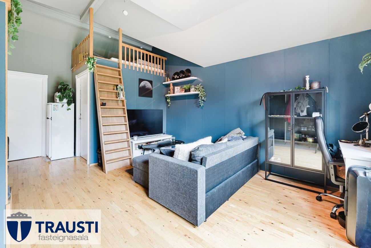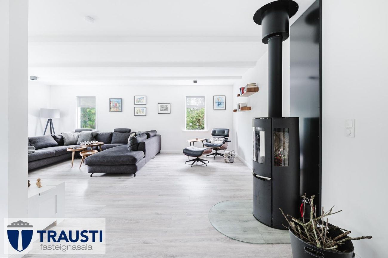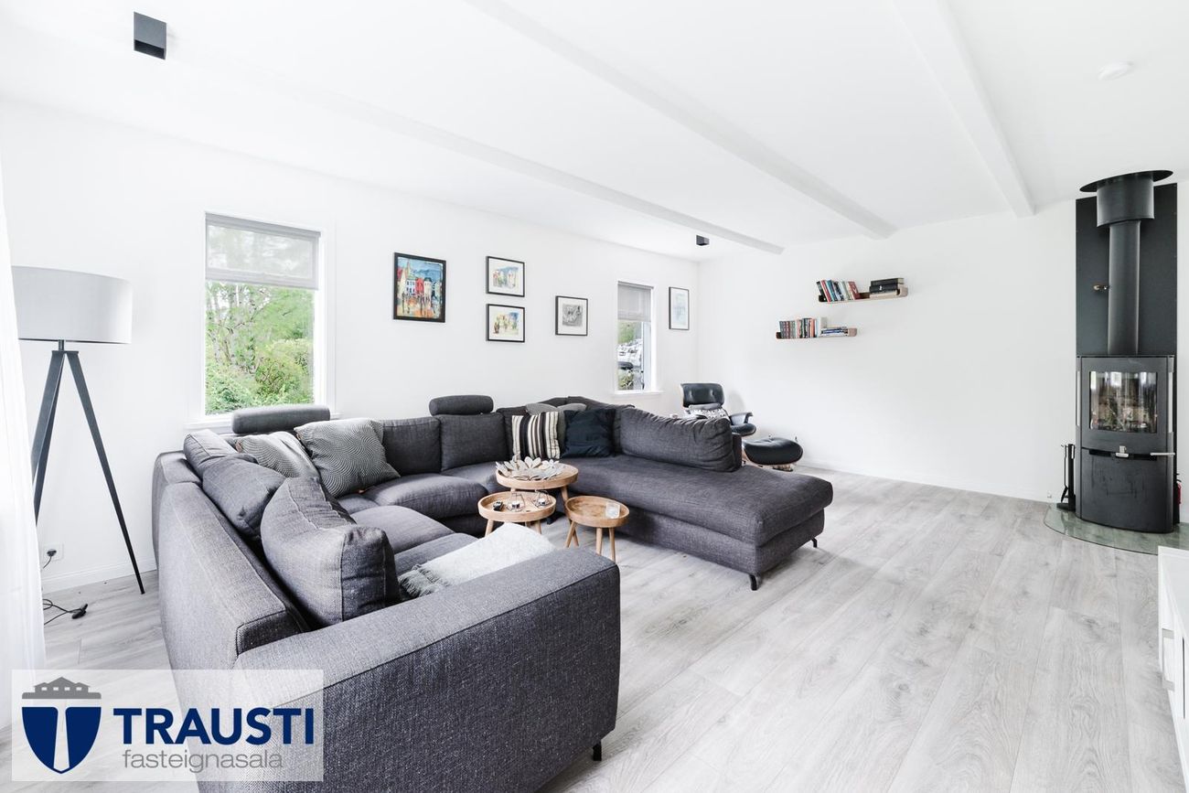 Opið og bjart rými með parketgólfi og kamínu, útgengt á stóran viðarpall í suður.
