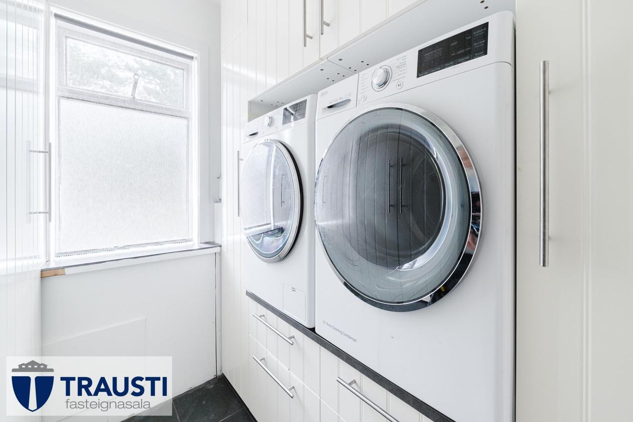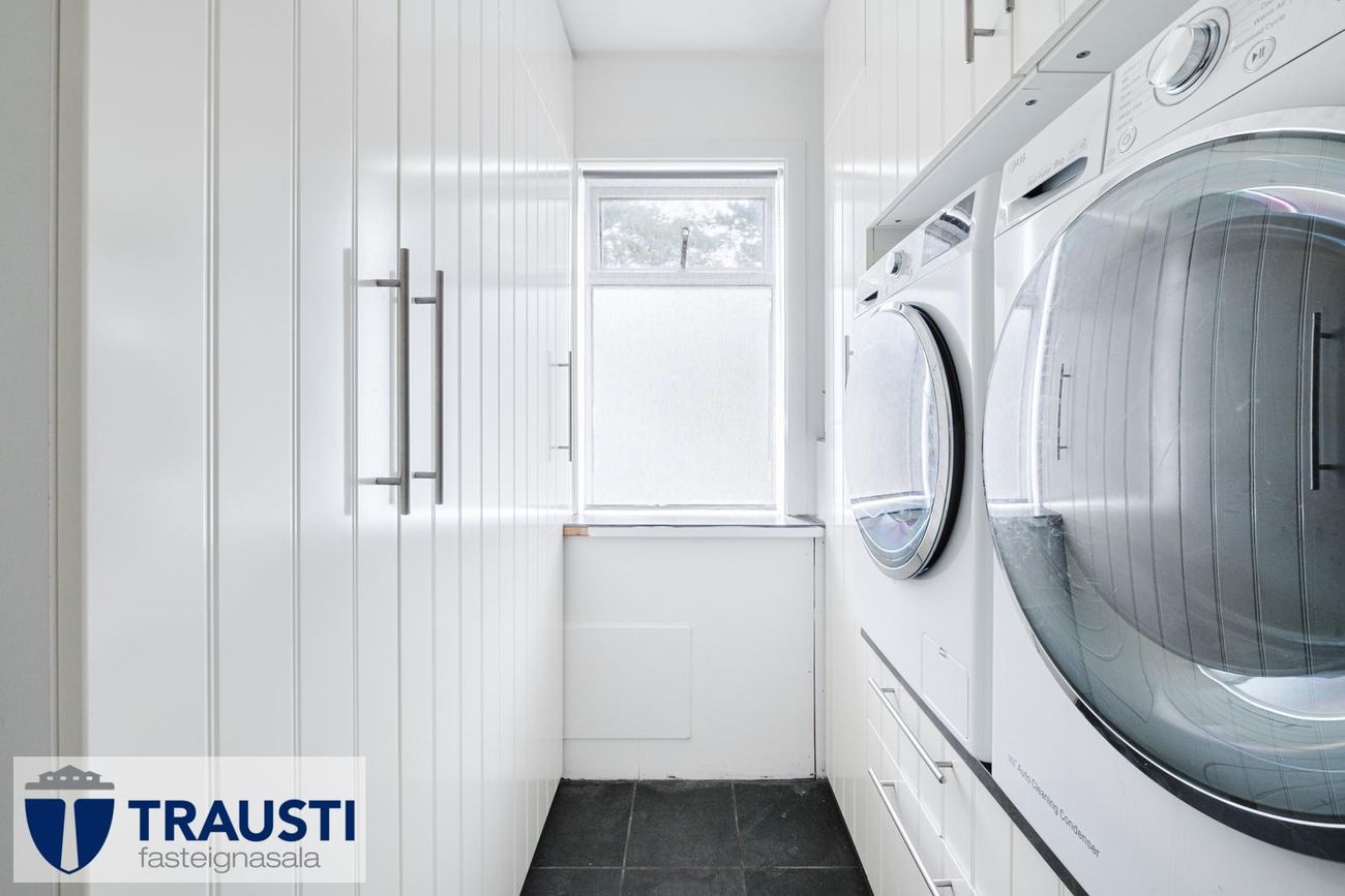 Þvottahús með skápum, þvottavél og þurrkara.