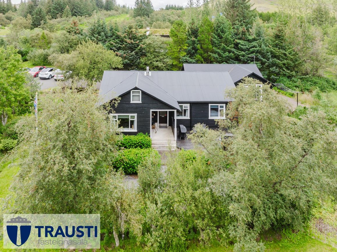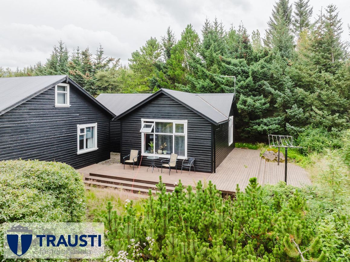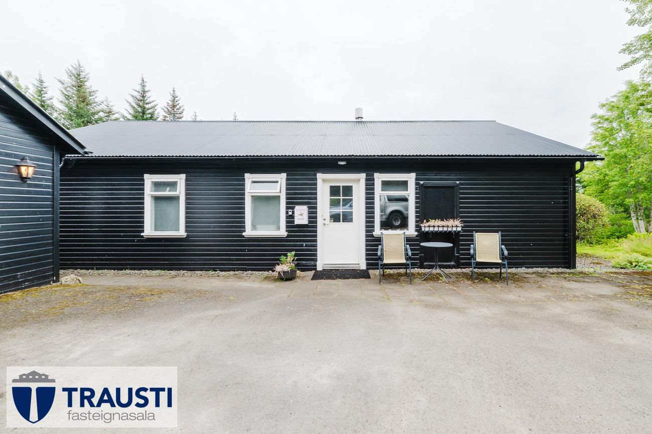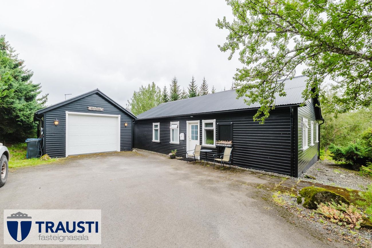 Tvær eignalóðir með möguleikum til viðbótarbygginga. Hús með opnu rými, eldhúsi, tveimur svefnherbergjum, baðherbergi, þvottahúsi og stúdíóíbúð í bílskúr. Garður vel hirtur og viðarpallur með heitum potti.