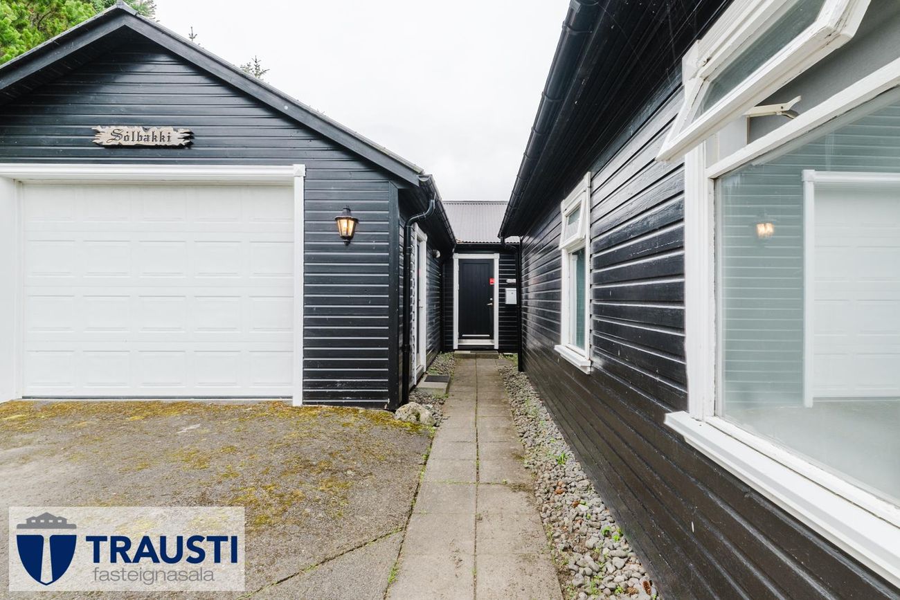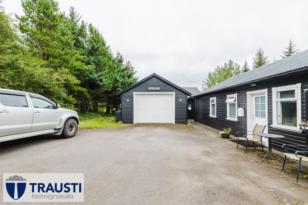 Stór bílskúr með stúdíóíbúð, geymslu og viðarpall. Malbikuð innkeyrsla með rafhleðslustöð.