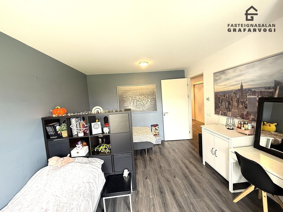 Svefnherbergin eru tvö, þau eru bæði mjög rúmgóð. Inn af hjónaherberginu er gott fataherbergi.