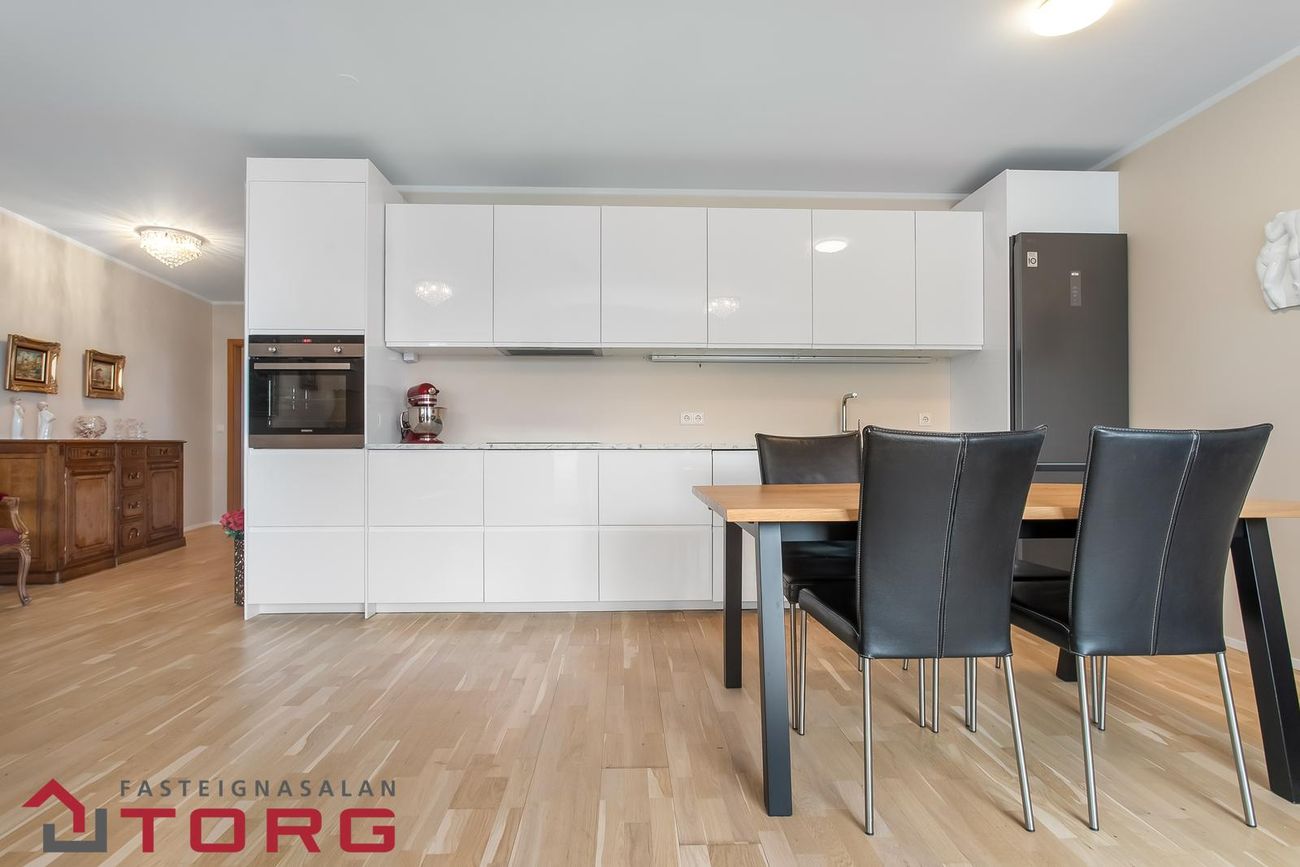 Eldhús. Opið og stórt eldhús með hvítri háglans innréttingu. Helluborð og loftgleypir. Uppþvottavél er inn í innréttingu. Stór ísskápur sem fylgir með. Bakaraofn í vinnuhæð.