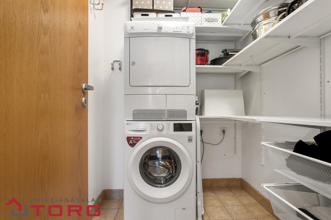 Þvottahús. Sérþvottahús er innan íbúðar. Flísar á gólfi og gott hillupláss.