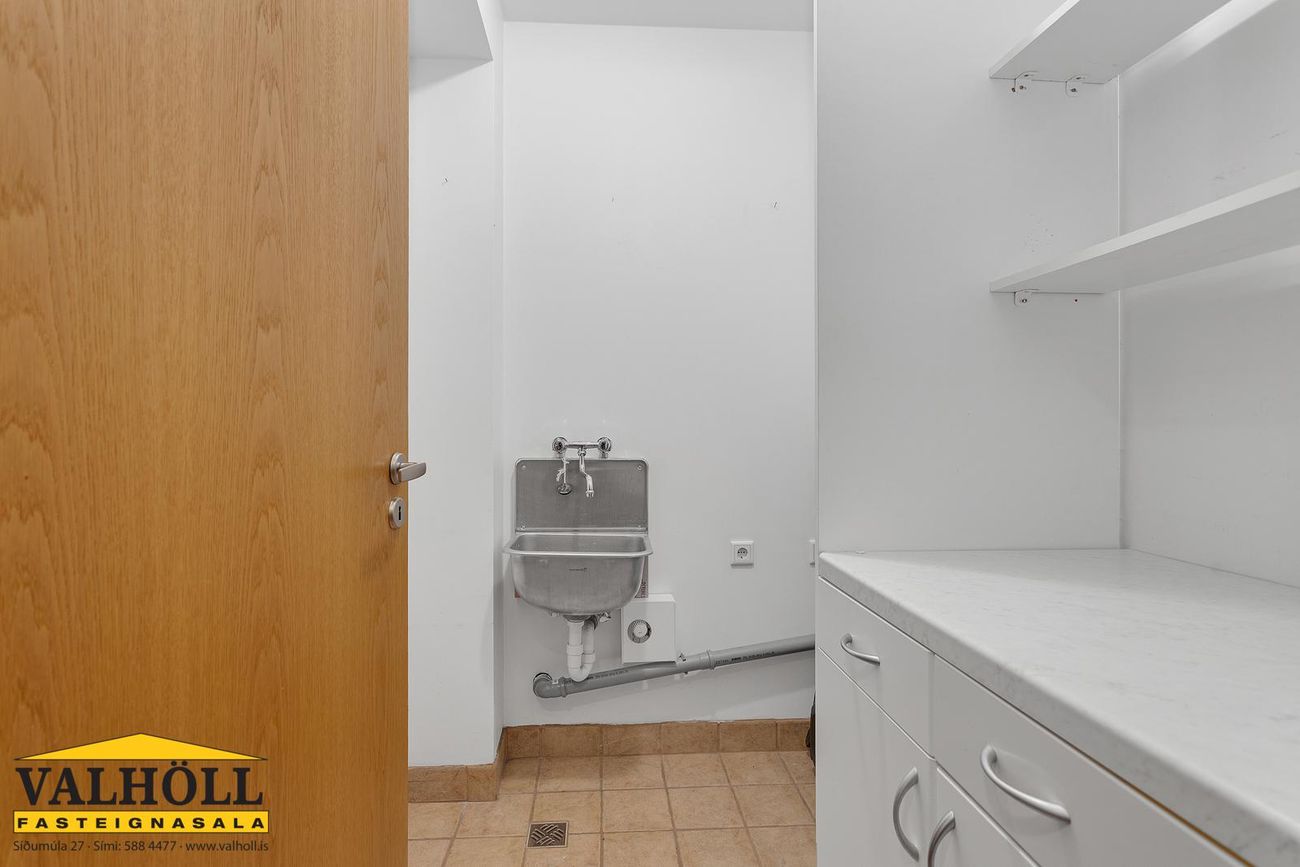Þvottahús. Sérþvottahús er innan íbúðar. Flísar á gólfi og gott hillupláss.