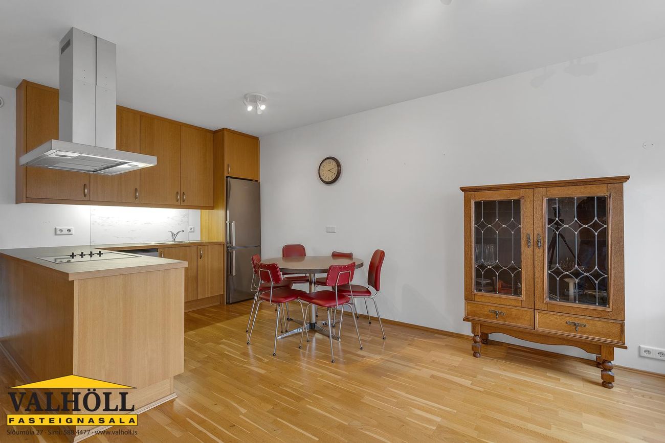 Eldhús. Opið og stórt eldhús með hvítri háglans innréttingu. Helluborð og loftgleypir. Uppþvottavél er inn í innréttingu. Stór ísskápur sem fylgir með. Bakaraofn í vinnuhæð.