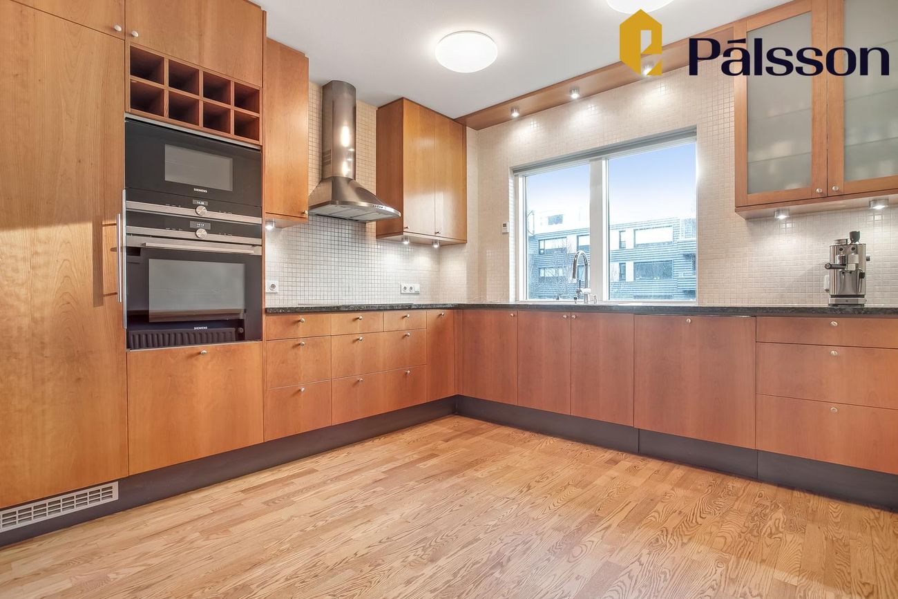 Eldhús Mikið skápapláss, parket á gólfi og myndar opið rými við stofu