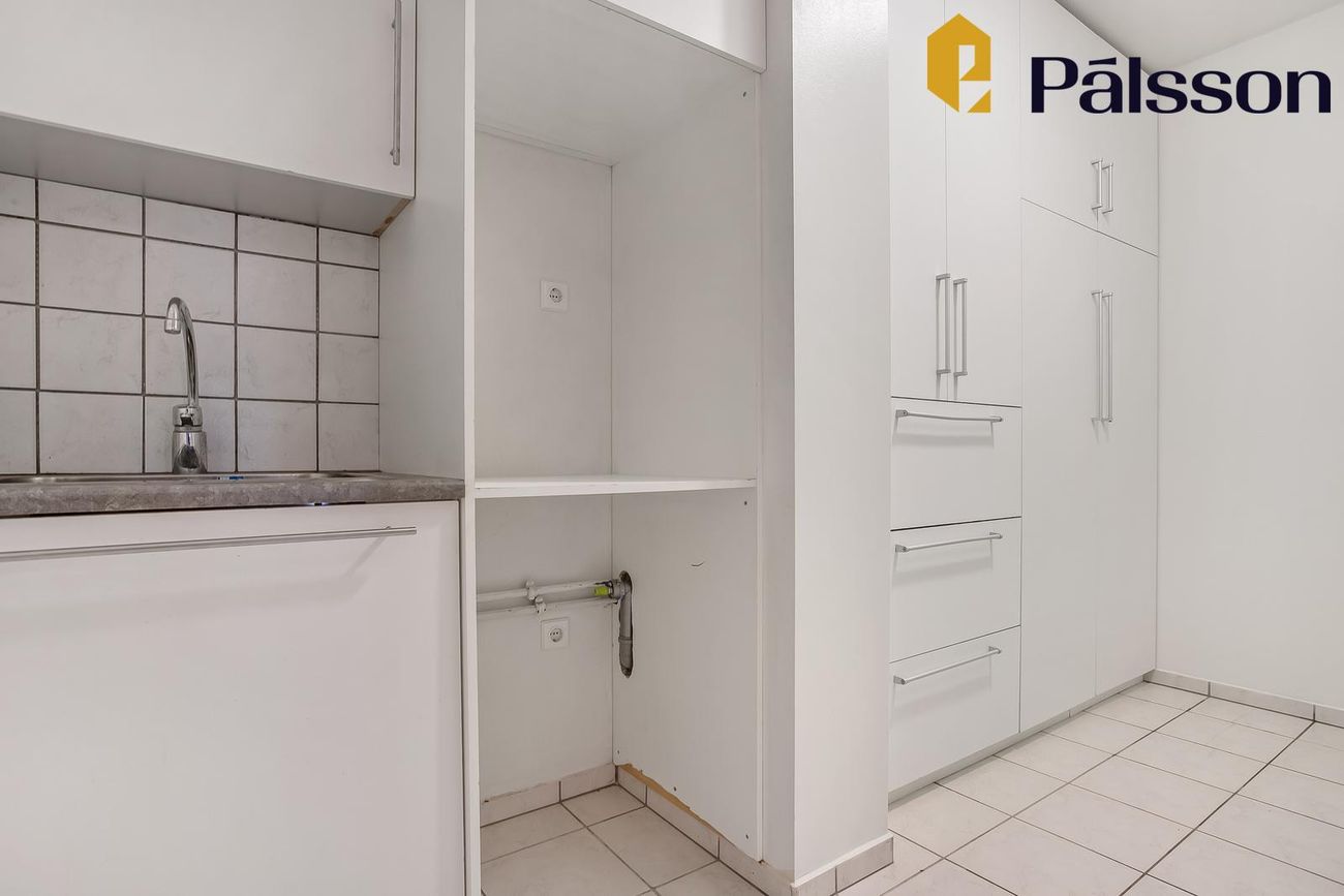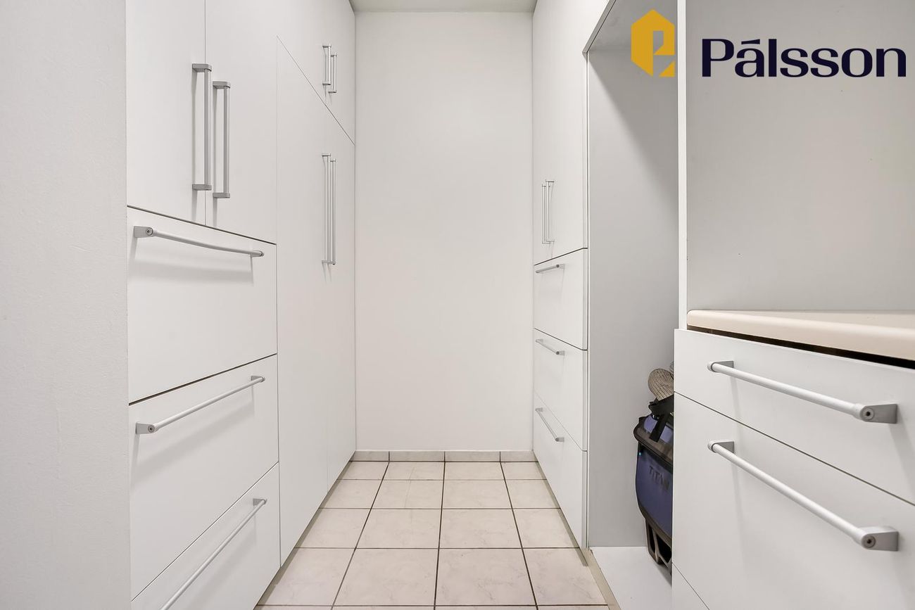 Þvottahús er rúmgott með miklu skápaplássi og á gólfum eru flísar.