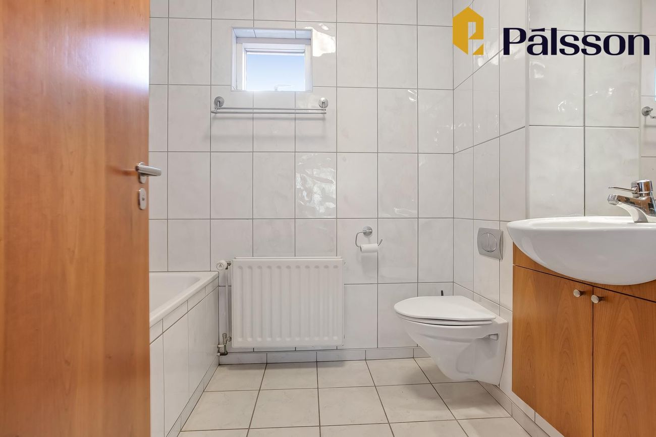 Hjónaherbergi er með flísalagt baðherbergi með innréttingu og baðkari.