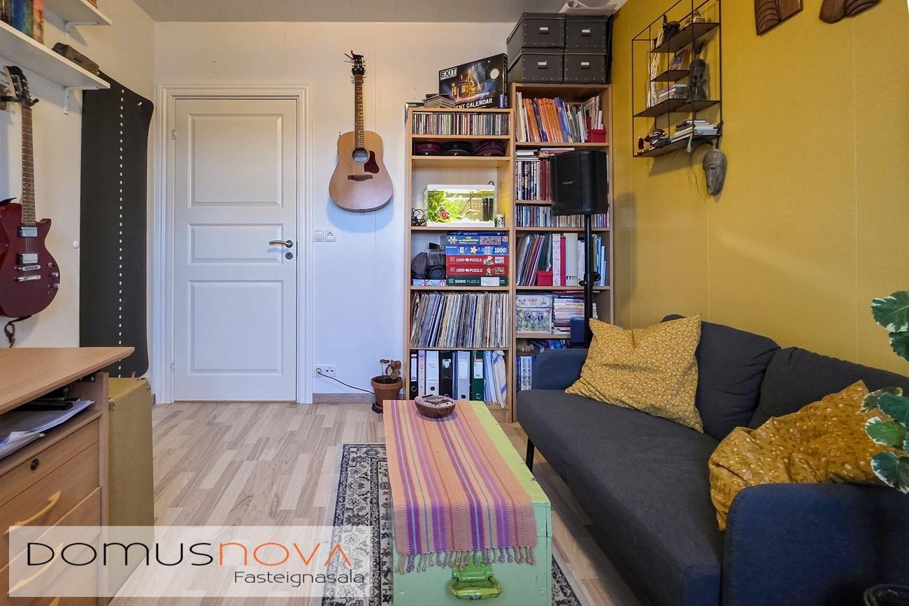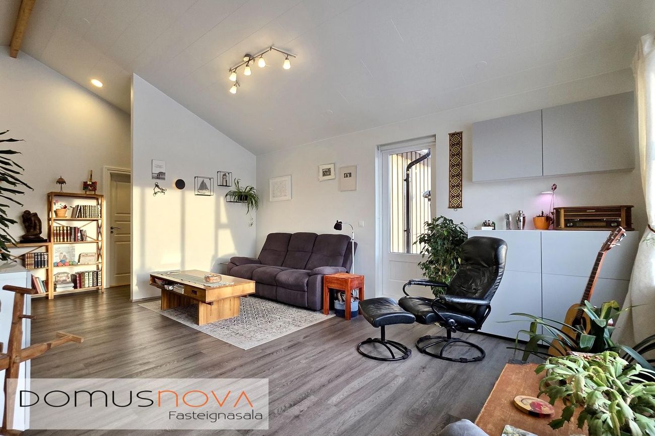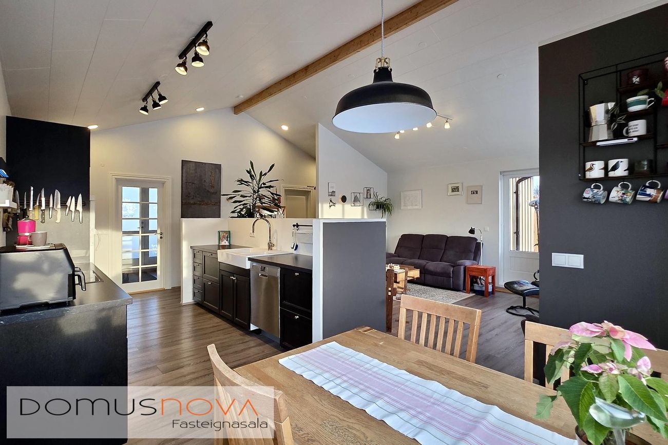 Stofan og eldhúsið mynda opið rými með lofthæð. Parket á gólfi.