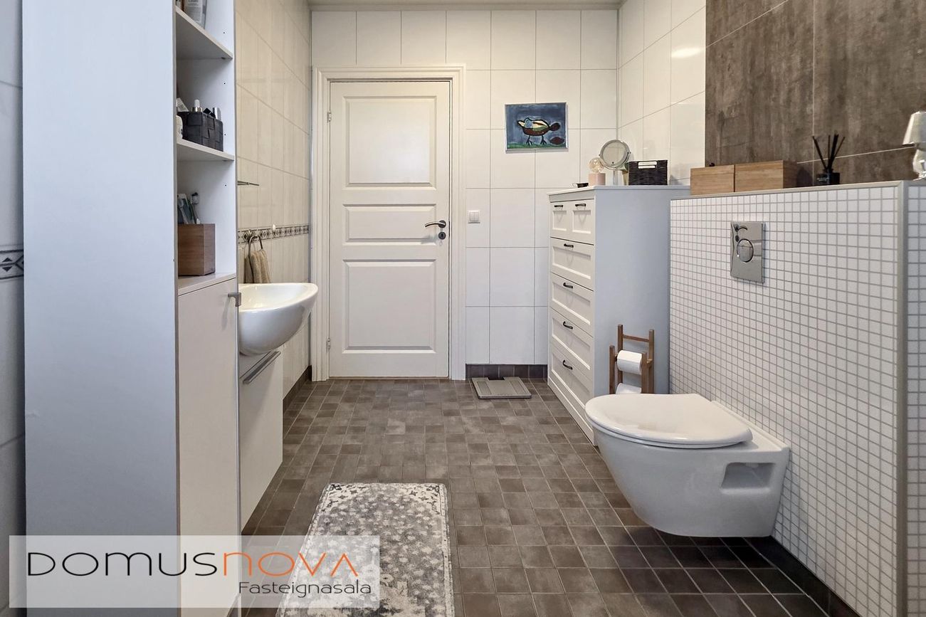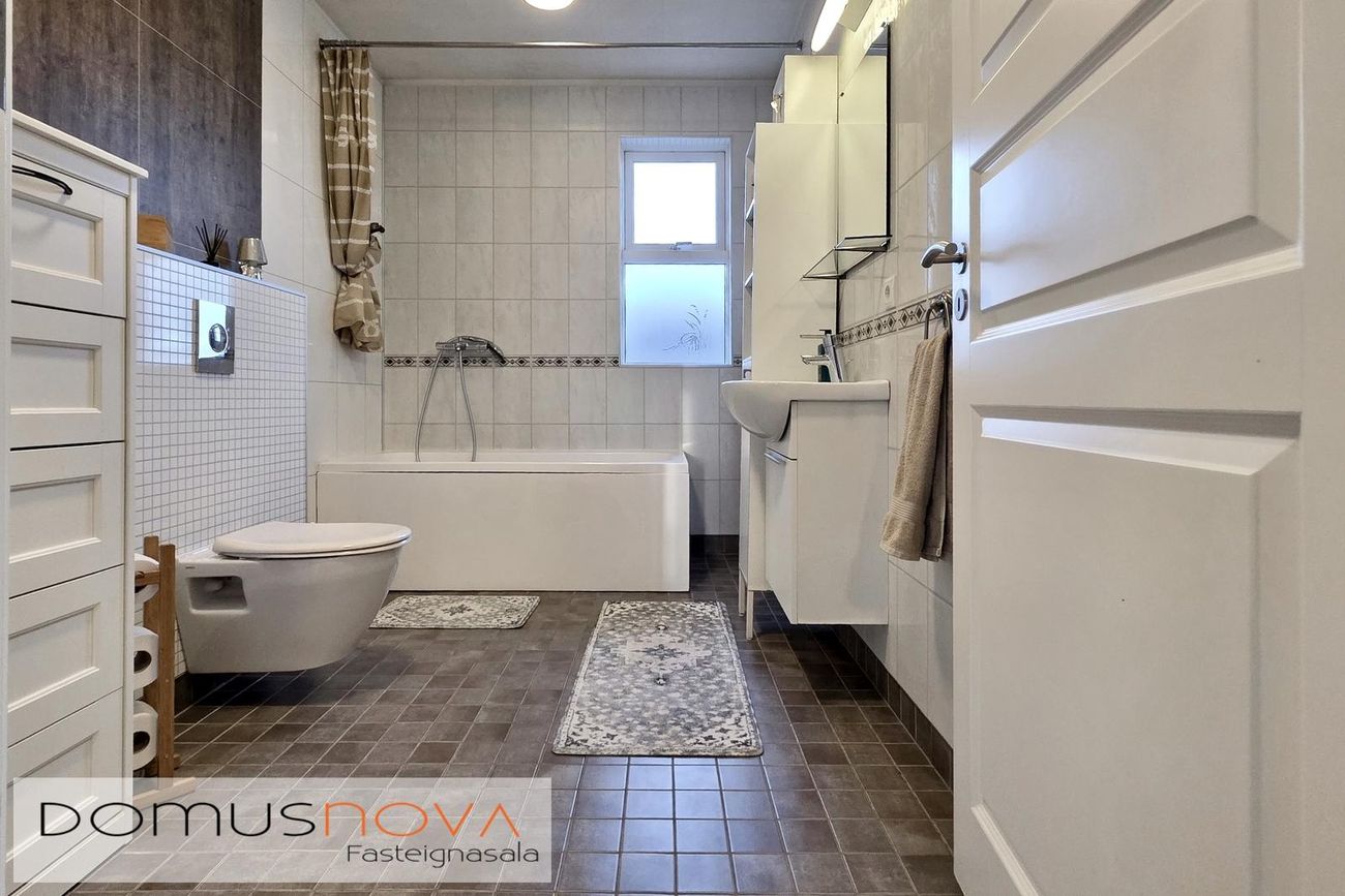 Flísalagt baðherbergi með baðkari, skáp og salerni.