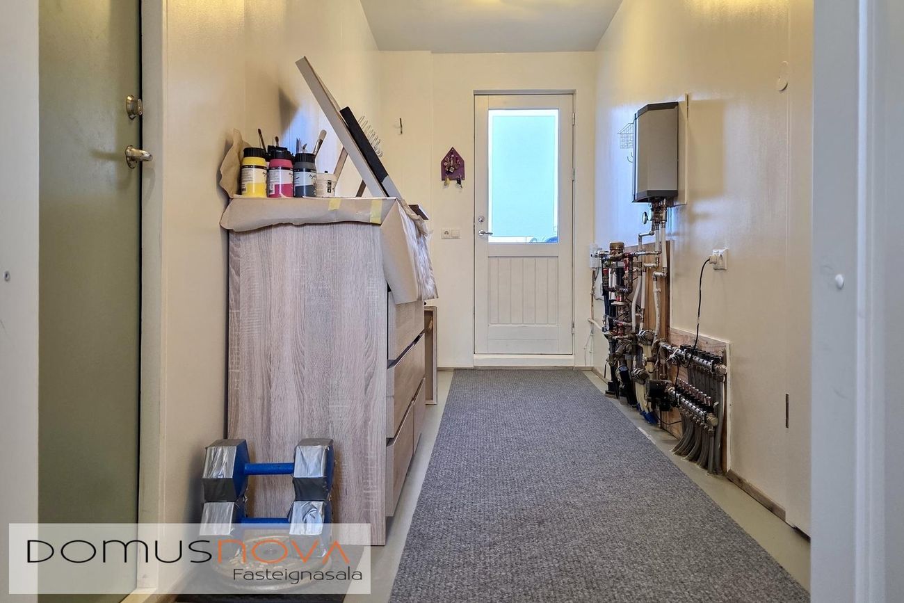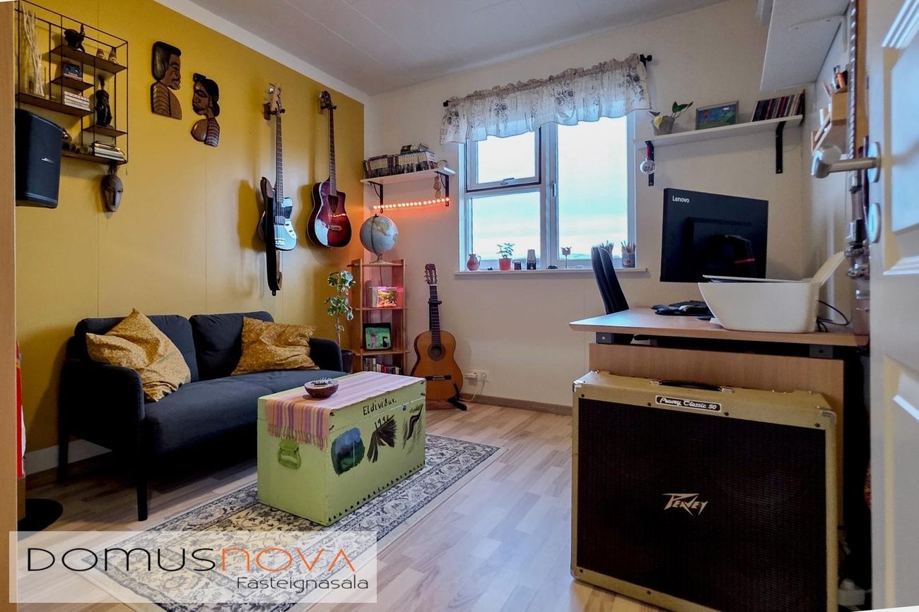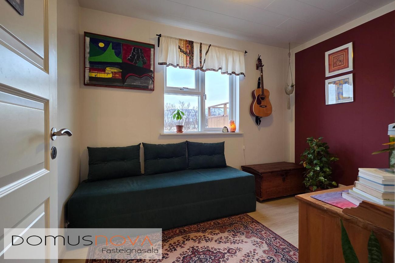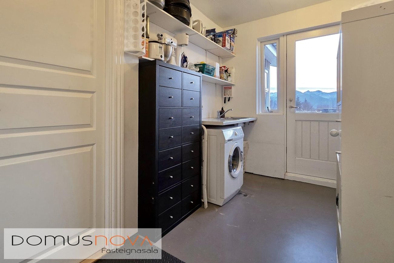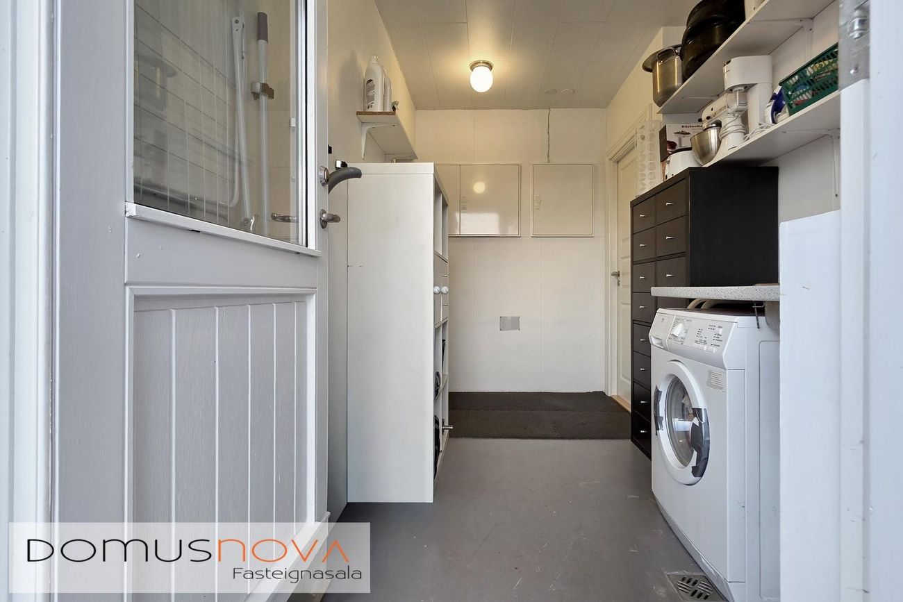 Einbýlishús með forstofu, eldhúsi, stofu, fjórum svefnherbergjum, baðherbergi, þvottahúsi og geymslu. Bílskúr breyttur í herbergi.