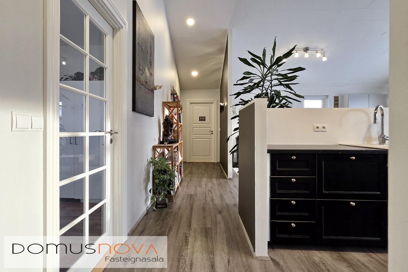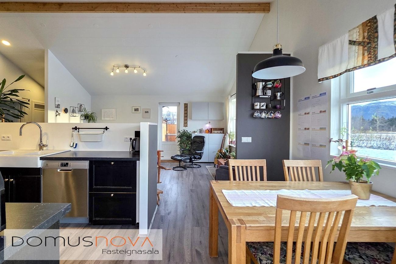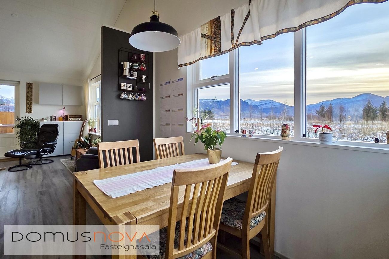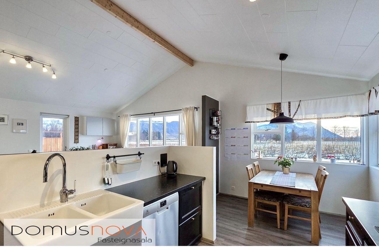 Innrétting með borðkrók, ný borðplata frá 2024. Útganga út á lóð.