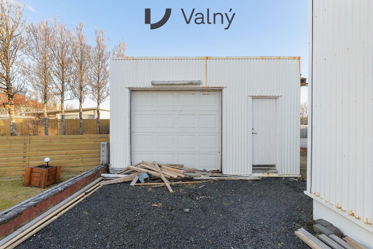 Bílskúr er séreign efri hæðar, 42,80 m² að stærð og hefur verið nýttur sem ókynnt geymsla í nokkurn tíma. Bárujárn á þaki hefur verið endurnýjað.