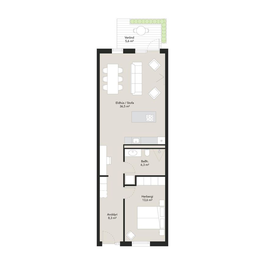 Íbúð með 2 svefnherbergi, opnu stofu/eldhúsi, suðursvala og sameiginlegri geymslu. Fullbúin með gólfefnum, rúllugardínum og tækjum.