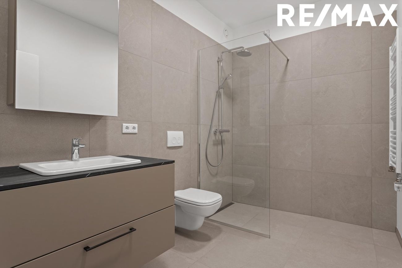 Baðherbergi með walk-in sturtu, flísum á gólfi og veggjum, handklæðaofni, upphentu salerni og baðinnréttingu með handlaug.