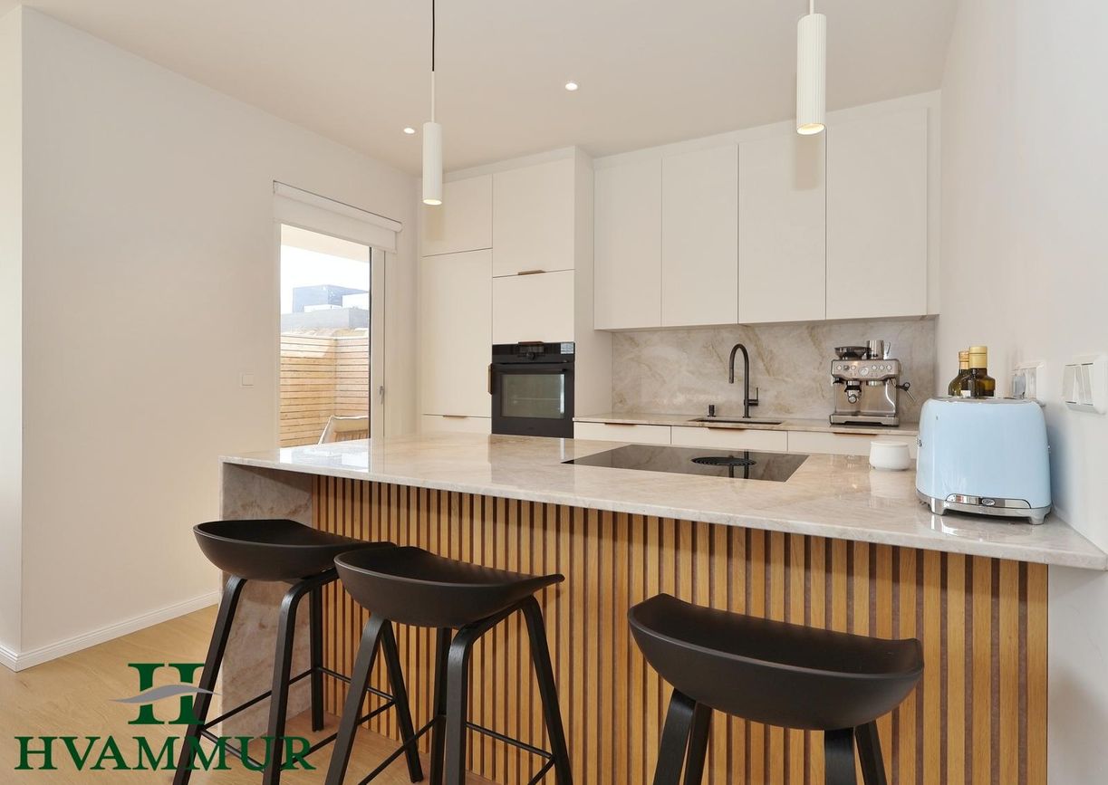 Eldhús, vönduð innrétting frá Brúnás með Taj Mahal steini á bekkjum og eyju frá S.helgasyni ehf. Ísskápur og uppþvottavél eru innfelld í innréttingu. Bora helluborð með innbyggðri viftu. Úr eldhús er hurð út á sólpall til suðurs.
